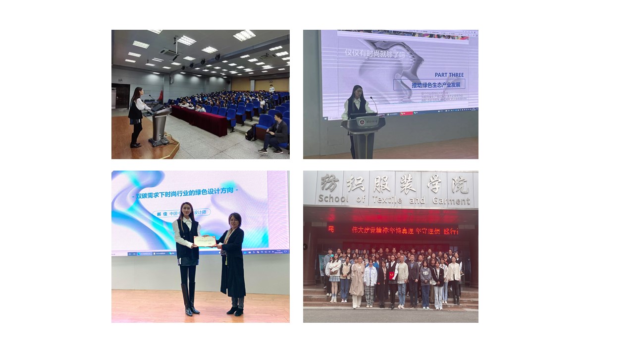 2021年10月19日,应纺织服装学院邀请,中国十佳设计师郝佳在5教117教室为学院师生作了一场以《双碳需求下时尚行业绿色设计方向》为题的学术报告,报告会由学院副院长袁惠芬教授主持,服装系教师、研究生和百余名本科生聆听了此次报告。