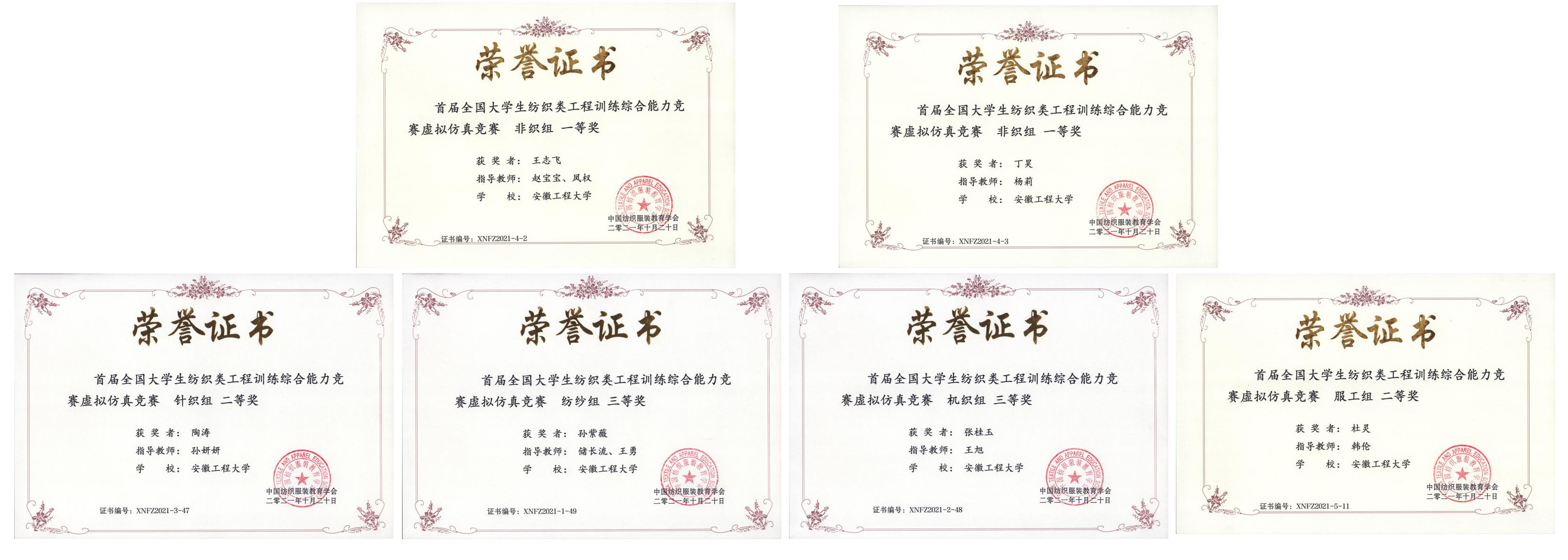 由中国纺织服装教育学会主办,纺织服装虚拟仿真专家委员会、天津工业大学、西安工程大学、大连工业大学、南通大学、北京润尼尔网络科技有限公司共同承办的首届全国纺织类大学生工程训练综合能力(虚拟仿真)竞赛结果于近日公布。本次竞赛共有来自26所院校的1878名学生参赛。经过预赛和决赛两个阶段,我院学生在纺纱、机织、针织、非织、服工五个大组的比赛中均取得了优异的成绩,共获得一等奖2项,二等奖2项,三等奖5项。其中,非织组荣获一等奖2项、三等奖1项;纺纱组获三等奖1项;机织组获三等奖1项;针织组获二等奖1项、获三等奖1项;服工组获二等奖1项、获三等奖1项。获奖名单如下: