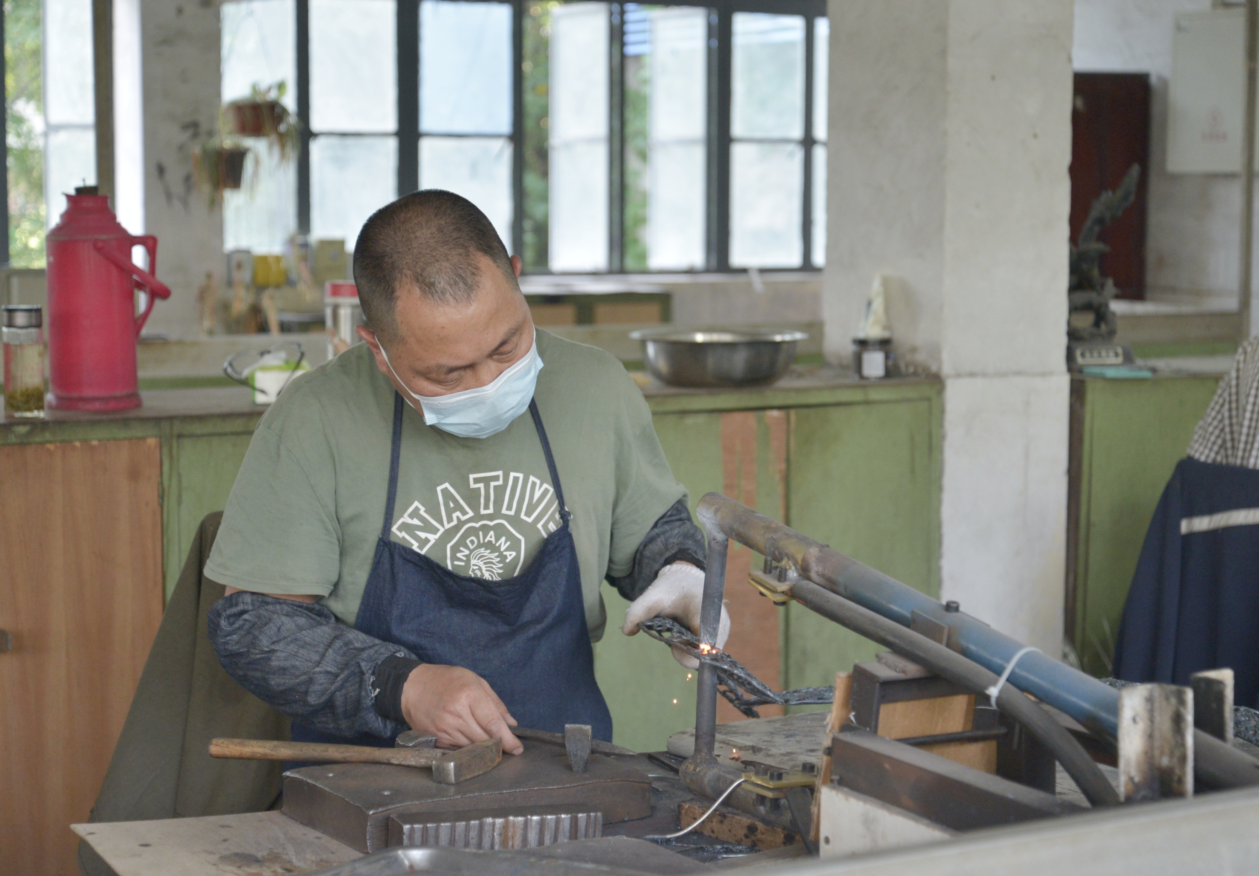 步入博物馆,映入眼帘的是一幅幅芜湖铁画著作,墙壁上的铁画著作栩栩如生,以锤代笔,以铁作墨,以砧为案,经剪、叠、铆、錾、锻、焊、锉等多道独特的手工技艺,才得以成画。画面黑白分明,虚实相生,同学们被其深深吸引,感叹铁画恢弘壮丽的同时,更钦佩工匠们的精湛技艺。志愿者们拜访了当代铁画大师汤传松老师,并在老师的带领下了解了芜湖铁画的制作过程和发展现状,并谋划了下一步暑期社会实践活动方案。