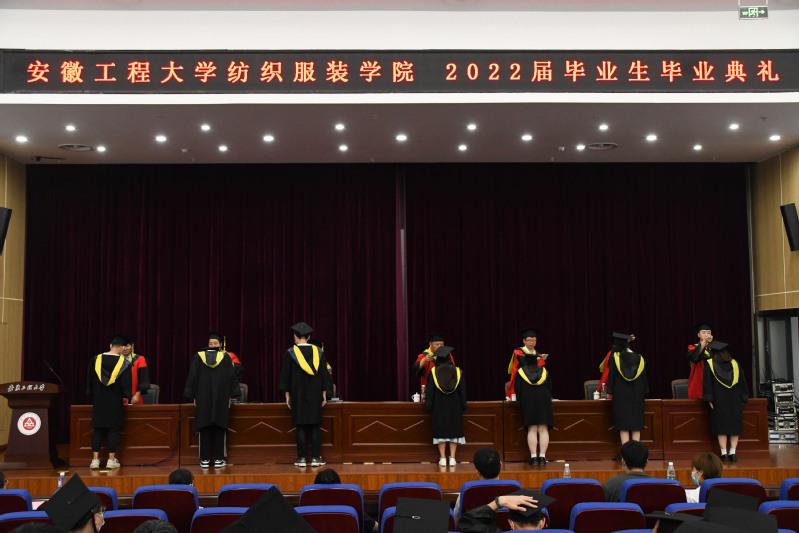 毕业典礼在庄严的国歌中拉开序幕。副院长徐珍珍宣读了《关于表彰纺织服装学院2022届先进个人、先进集体的决定》,副院长袁惠芬宣读了《安徽省2022年品学兼优毕业生名单》。毕业生代表纺织182高俊,教师代表谢艳霞老师、毕业班辅导员代表童超梅老师分别上台发言。