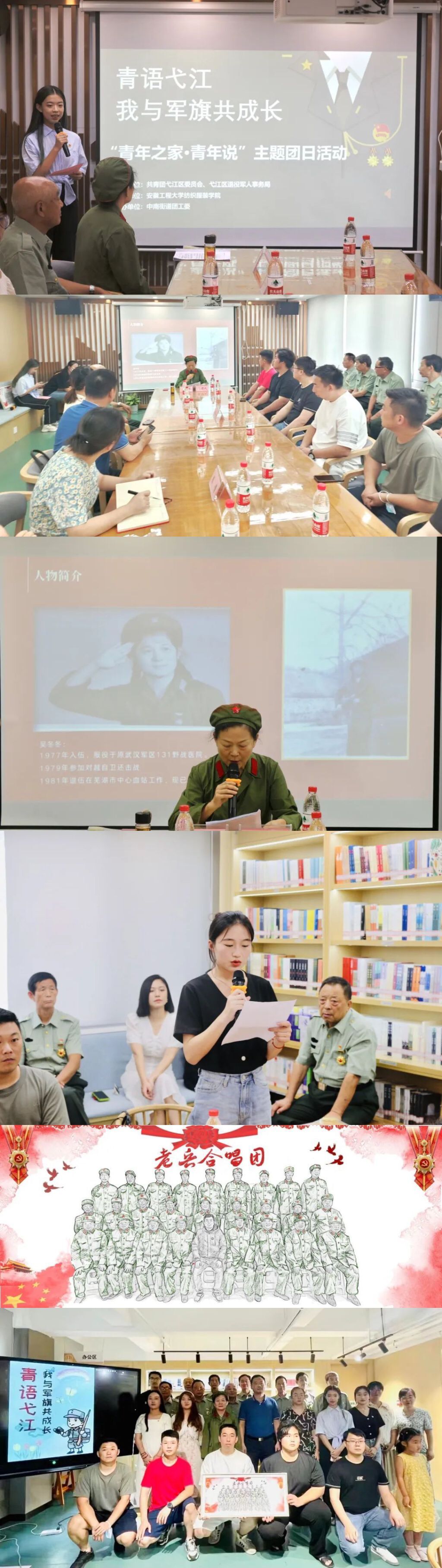 729日下午,纺织服装学院团委和弋江区在弋江南书苑共同举行“我与军旗共成长”为主题的主题团日活动,弋江区区属各街道的青年退役军人代表、弋江区老兵合唱团的老兵代表、弋江区退役军人事务局、芜湖市爱无疆社会服务中心工作人员和纺织服装学院团委负责人参加活动,本次团日活动由纺织214班陈焯琳主持。