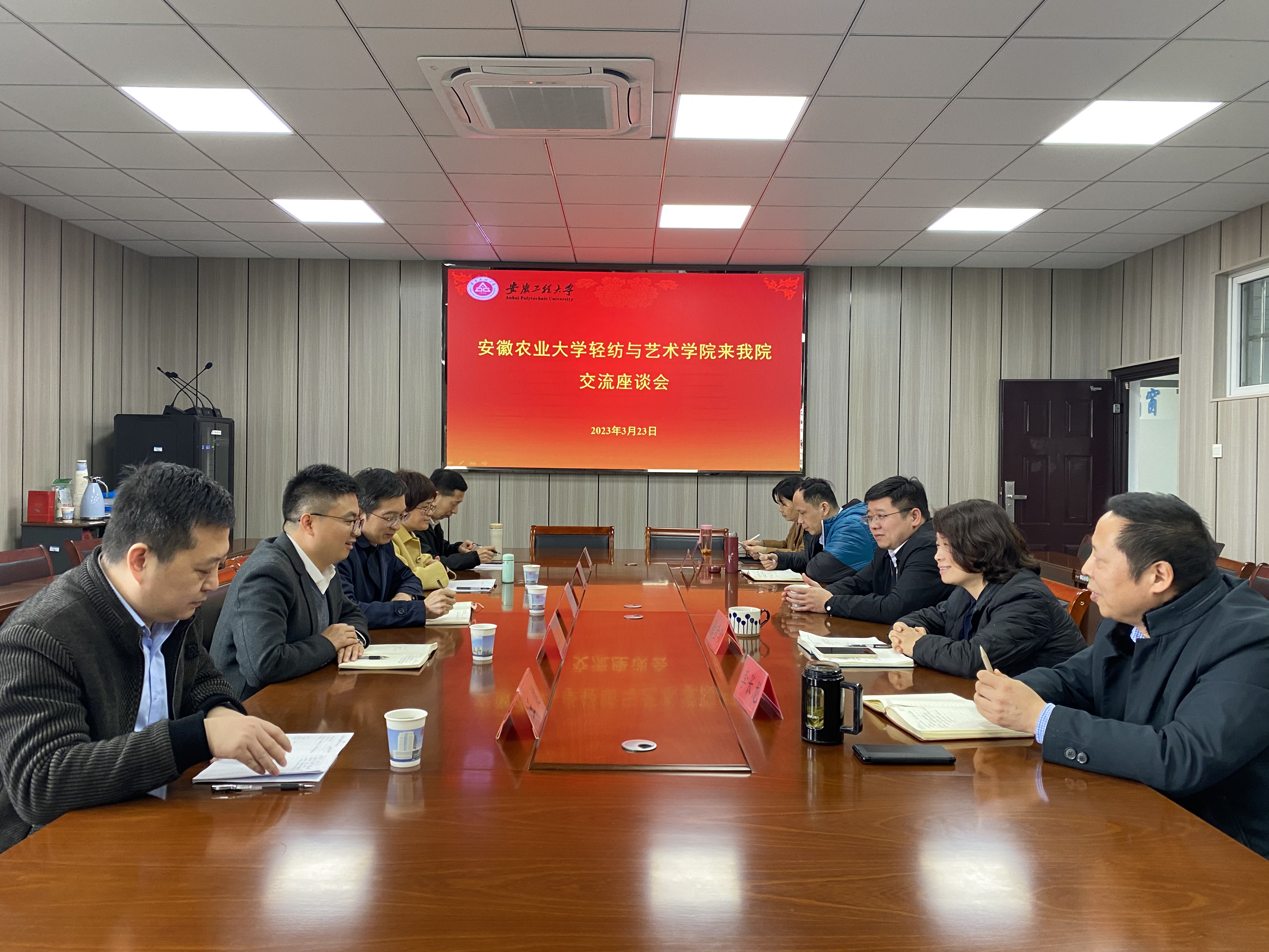 323日,安徽农业大学轻纺与艺术学院党委书记夏成云、院长汪钟凯等一行五人来我院开展调研交流。学院党委副书记(主持工作)徐珍珍、院长李长龙、副院长陶旭晨及谢艳霞教授参加交流会,校办公室主任林煦东应邀参加本次调研,会议由徐珍珍主持。