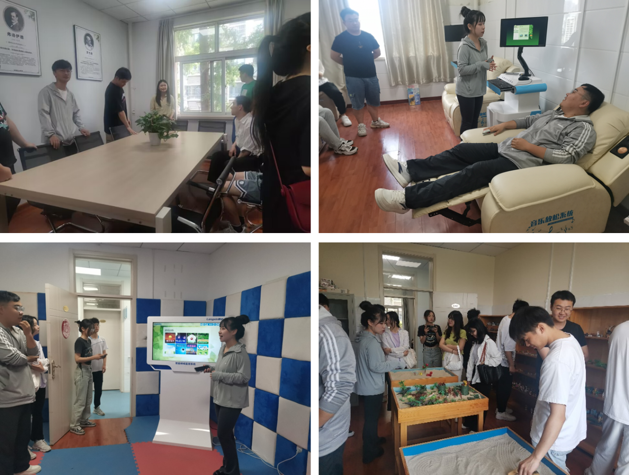 心理健康教育中心老师向同学们介绍了个体咨询室、团体辅导室、宣泄解压室、音乐放松室、沙盘活动室、心理测量室等特色心理功能体验室,并耐心讲解心理健康知识。