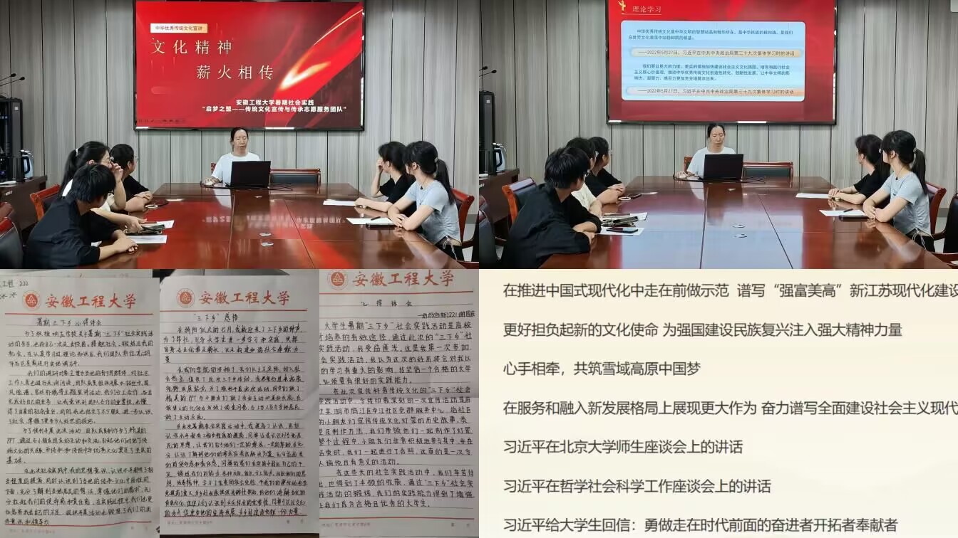 本着为乡村振兴贡献一份力的初心,更好增强青年学生的文化自信,在实践活动进行之前,团队成员系统学习了习近平总书记关于弘扬中华优秀传统文化和大力推动乡村振兴的重要讲话精神,同时,结合学习内容撰写心得体会、精心制作宣讲文案及视频。此外,团队成员还通过网络收集了大量芜湖地方优秀传统文化案例,为后续活动的开展做了充分的理论准备。