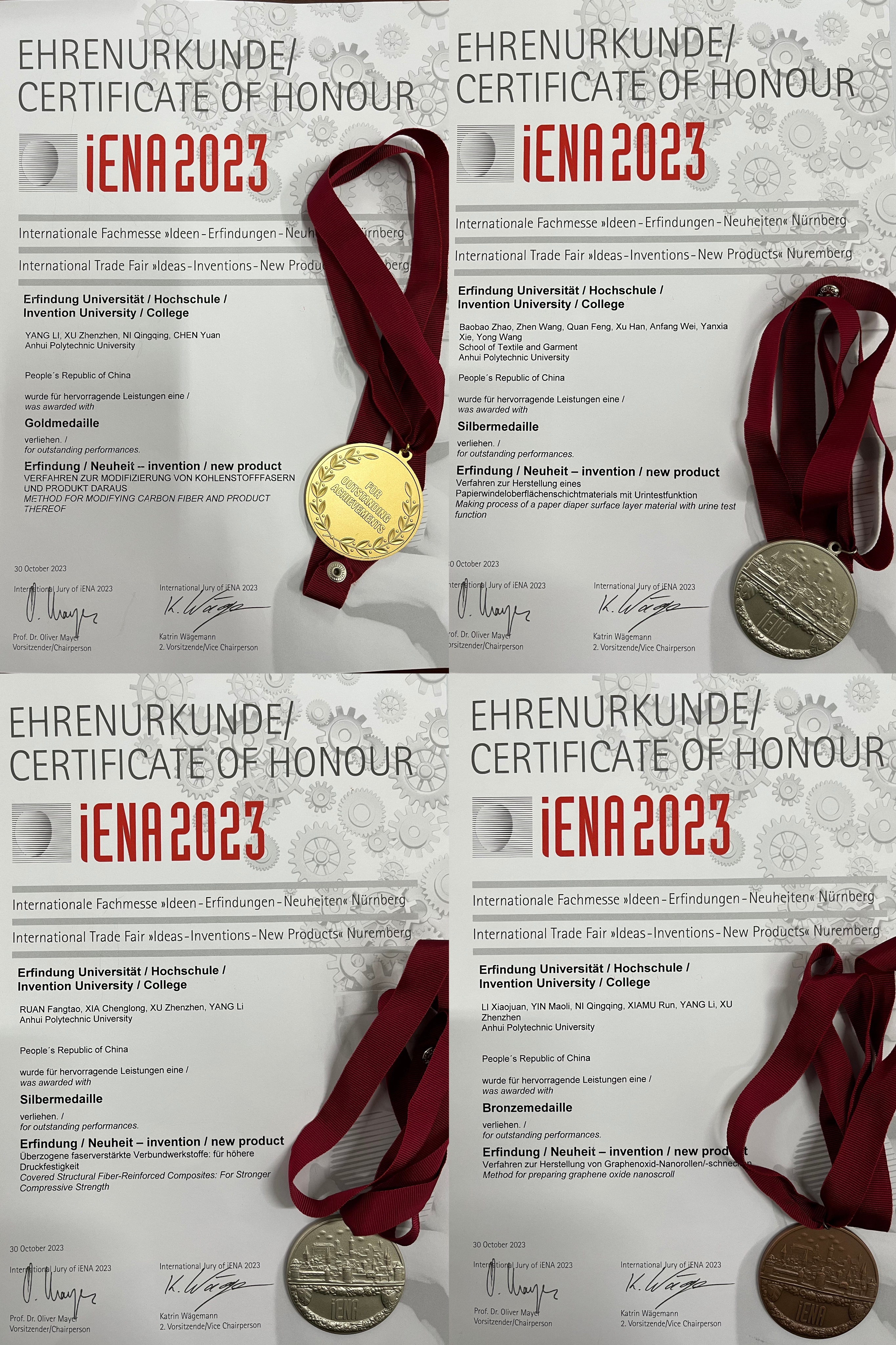 10月30日,为期三天的第75届德国纽伦堡国际发明展(IENA)在德国纽伦堡国际展览中心落下帷幕,我校纺织服装学院杨莉、阮芳涛、赵宝宝和李小娟老师团队的“一种碳纤维改性方法及其产品”、“包覆结构纤维增强复合材料:赋予更强的压缩性能”、“一种具有尿检功能的纸尿裤面层材料制作工艺”和“高效处理废水且可回收利用的氧化石墨烯纳米卷”四项发明专利参展,最终斩获金奖一项、银奖二项和铜奖一项,这也是我校首次参加国际发明展并取得好成绩。