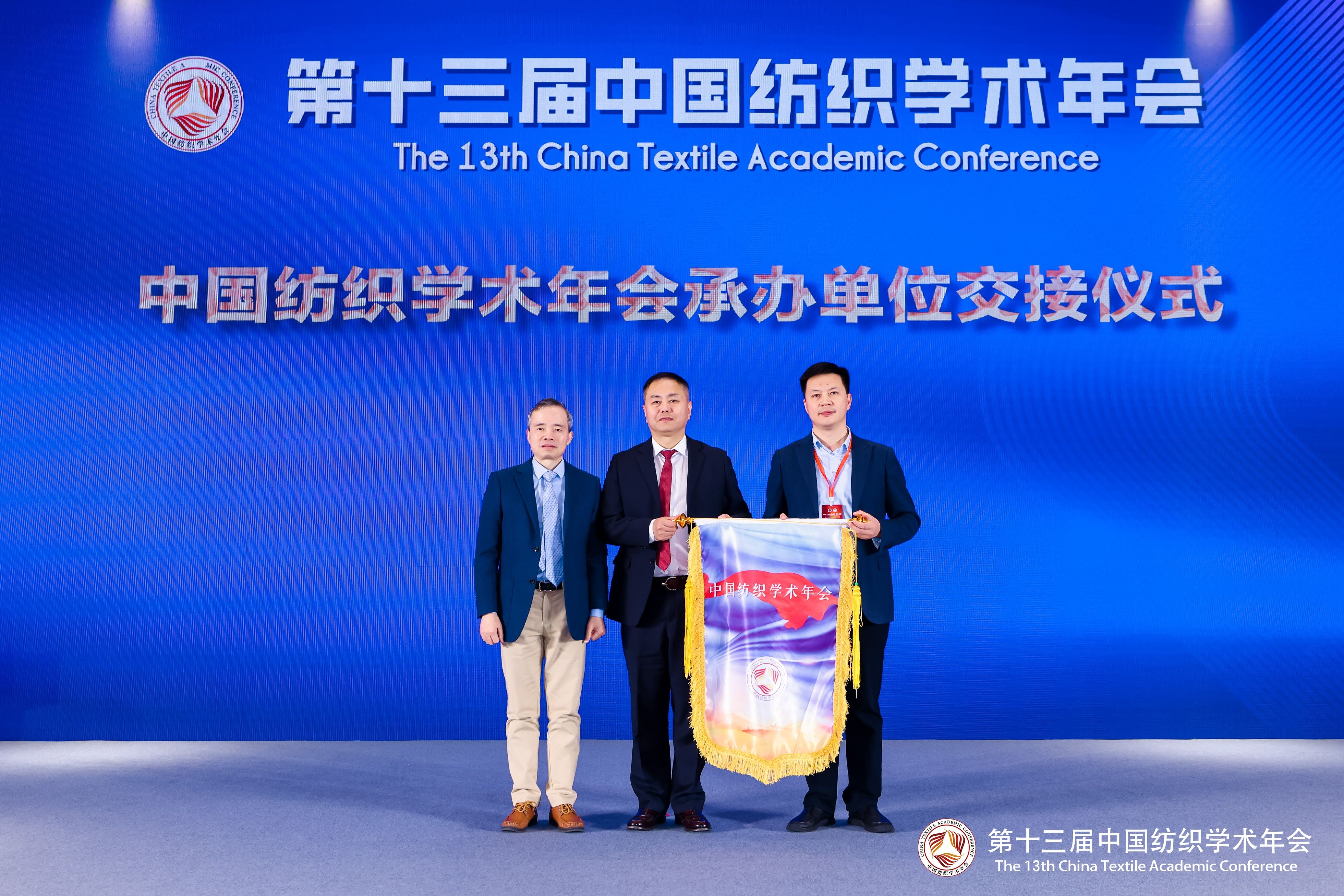 111112日,第十三届中国纺织学术年会在苏州隆重召开,年会以“学产融合 成果赋能 引领发展”为主题,由中国纺织工业联合会指导,中国纺织工程学会主办,苏州大学承办,中复神鹰碳纤维股份有限公司、苏州中纺学面料产业研究院协办,得到东华大学等多家单位的大力支持。我校党委常委、副校长凤权应邀率队参加年会,并在年会承办单位交接旗仪式上,从中国纺织工程学会理事长伏广伟手中接过学会承办旗,这也标志着中国纺织学术领域最顶级的盛会进入“芜湖筹备期”,第十四届中国纺织学术年会将于2024年金秋时节在芜湖召开。