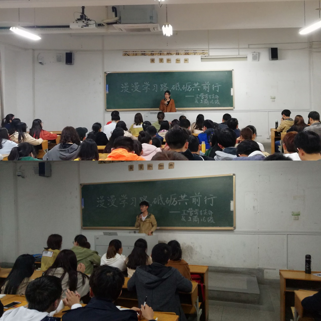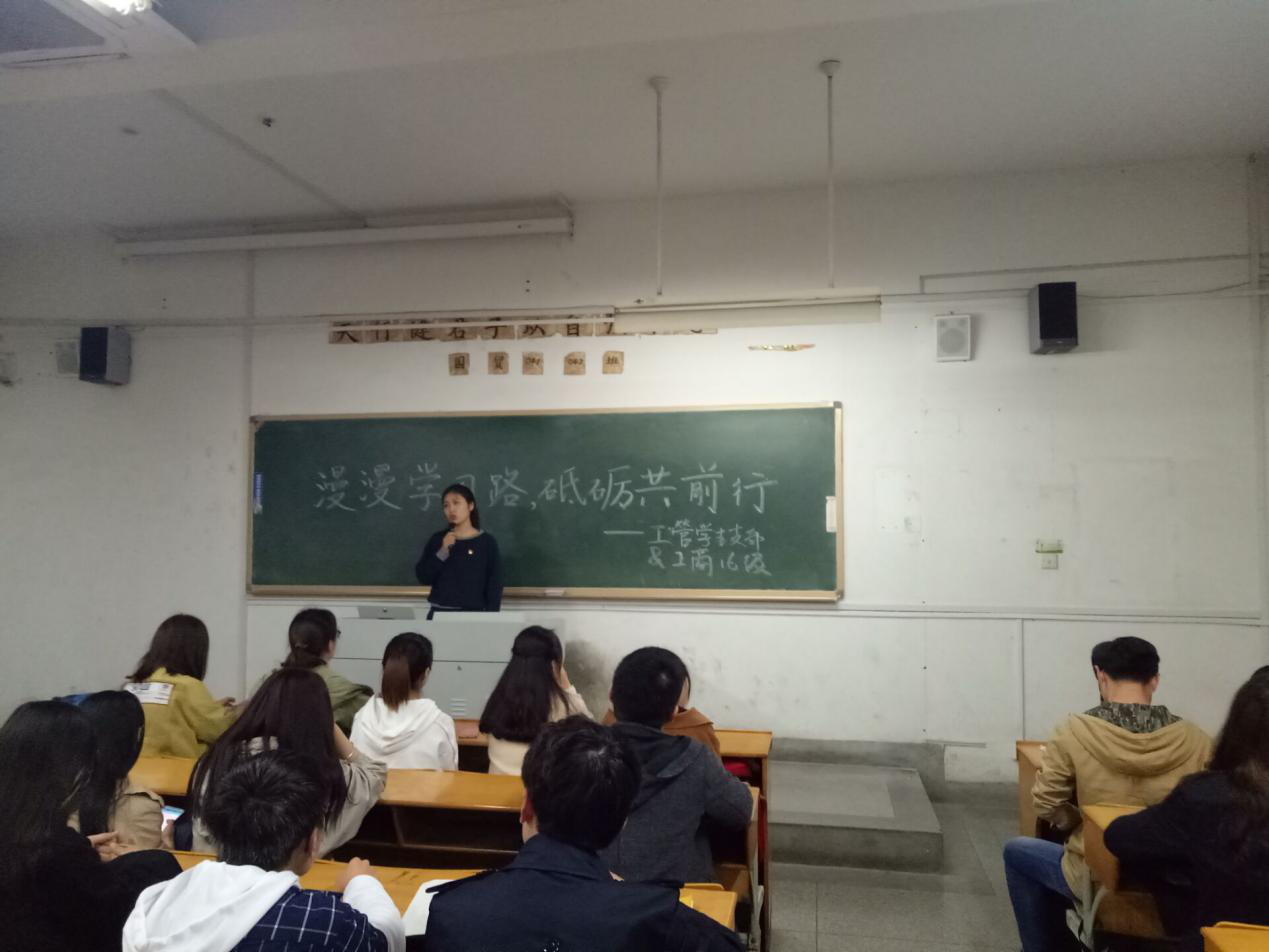 新时代,正是青年学子的舞台。新学期,大学生如何做好自己的专业学习规划?2018315日晚7点,管理工程学院工管学生支部在4309组织开展“漫漫学习路,砥砺共前行——工商管理专业学习交流讲座”主题活动,分享关于专业前景发展以及考研考证方面的经验和心得,全体党员和工商16级学子参加了活动。活动由工管学生支部书记赵恒梅主持并评点。