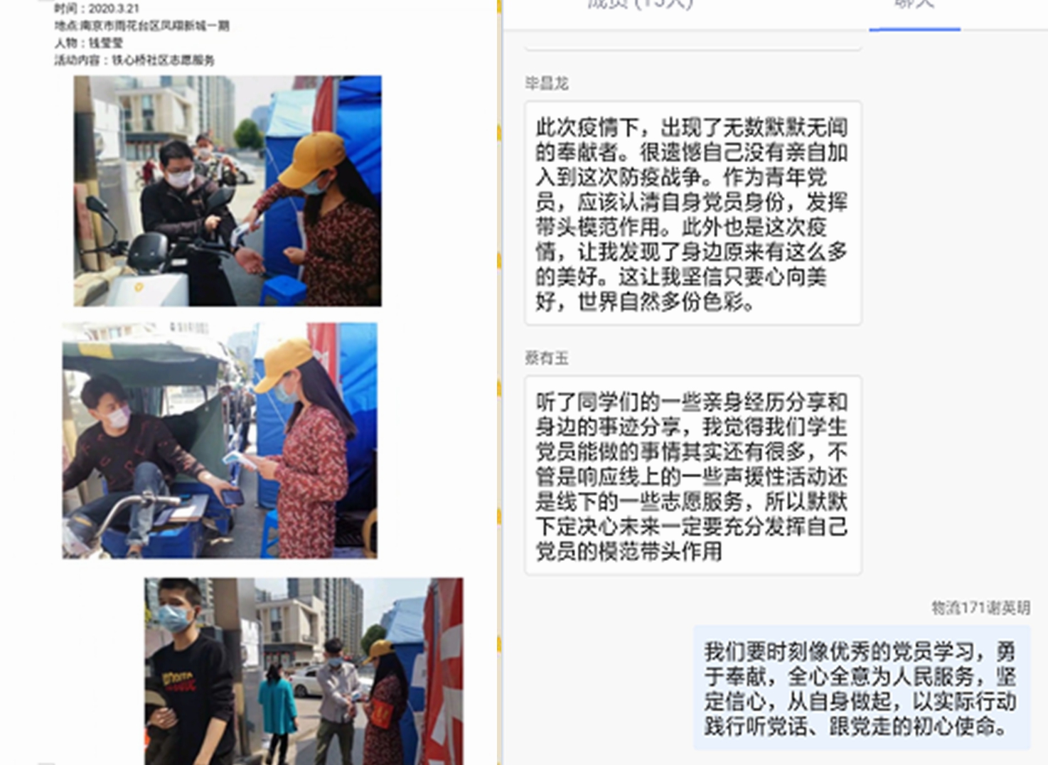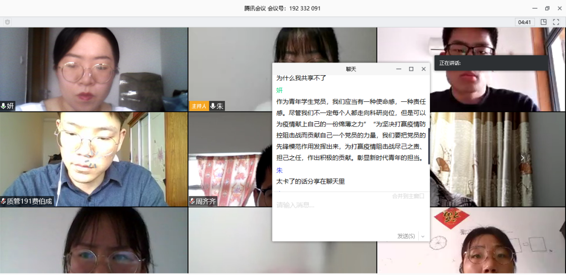 本次线上发言通过腾讯会议平台以支部为单位分成八个小组进行。学员们积极发言,用图片加文字说明的方式,分享了自己及身边党员奋战抗疫一线,共同抗击疫情的经历故事,阐述在抗击疫情的斗争中新时代青年学生党员对“责任与担当”理解和感受。大家纷纷表示,要积极参加当地防控防疫工作,带头协助学校、学院做好疫情防控工作,拒绝谣言、理性判断;按时完成网课学习,加强理论修养,贡献青年党员力量。