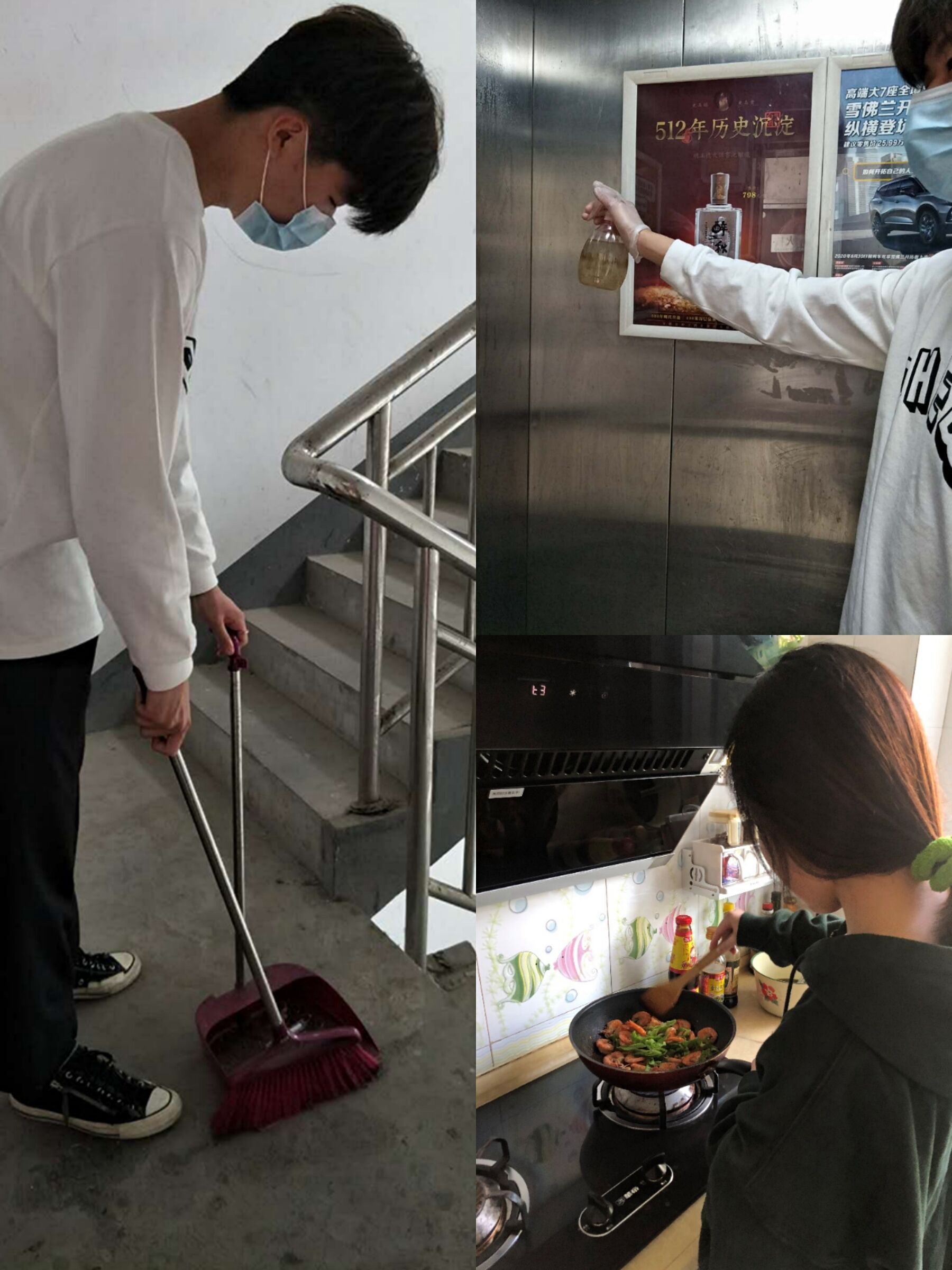 支部党员郝盈盈同学帮助打扫家乡的一个广场,广场是大家在疫情期间出入活动较多的地方,但是有时候会有人不注意卫生,随手乱扔垃圾。郝盈盈同学认识到崇尚劳动、热爱劳动、服务家乡,不应该只是一个口号,我们要身体力行、亲身实践,并提倡大家都应该树立崇尚劳动、热爱劳动,服务家乡的理念,争取为家乡、为祖国作出更多的贡献;朱宇龙同学参与了社区志愿活动,为小区的备用楼梯进行打扫以及进行电梯的消毒工作。