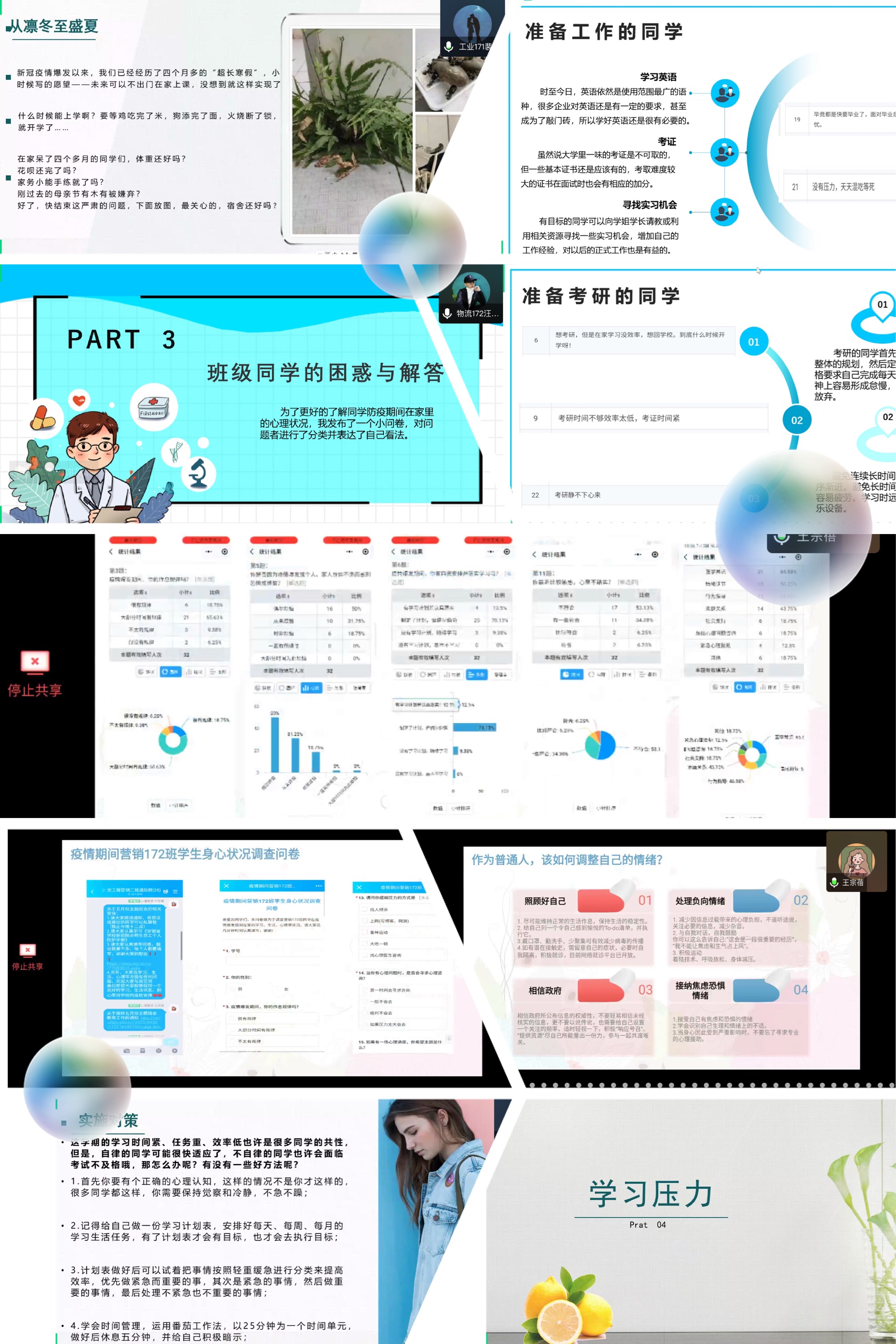 积极的线上讨论与共享。在各班级的主题班会上,同学们围绕“如何高效进行线上学习”、“抗击疫情期间易发的心理问题”、“疫情期间如何面对考研求职压力问题?”“返校后如何进行心理调适”等话题进行线上讨论,同学们纷纷发表见解与看法,交流心得与体会。通过积极交流,引导同学们理性看待疫情,以积极的心态和努力学习的方式来抗击疫情,积极创业就业,开展学习。