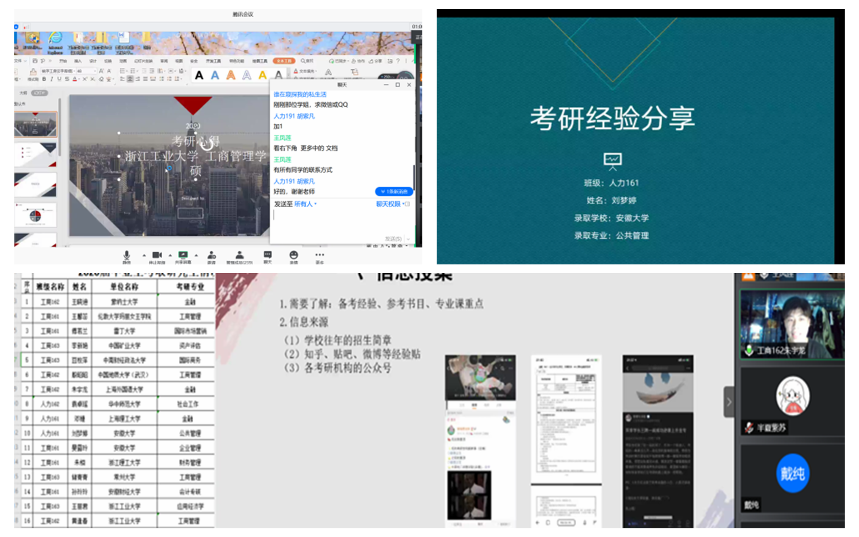 为帮助工商管理、人力资源管理专业准备考研学生掌握相关考研技巧、增强考研信心、提高考研成功率。69日,工商管理系教师党支部双带头人工作室借助“腾讯会议”平台举办了2020年考研经验交流会。本次“云交流”邀请了部分党员教师和考取蒙纳士大学、中南财经政法大学、中国地质大学(武汉)、中国矿业大学、华中师范大学、上海外国语大学、安徽大学的20余名优秀考研毕业生参加,吸引了2017、2018、2019级的250余名同学的积极参与。交流会由工商管理系教师党支部书记王凤莲主持。