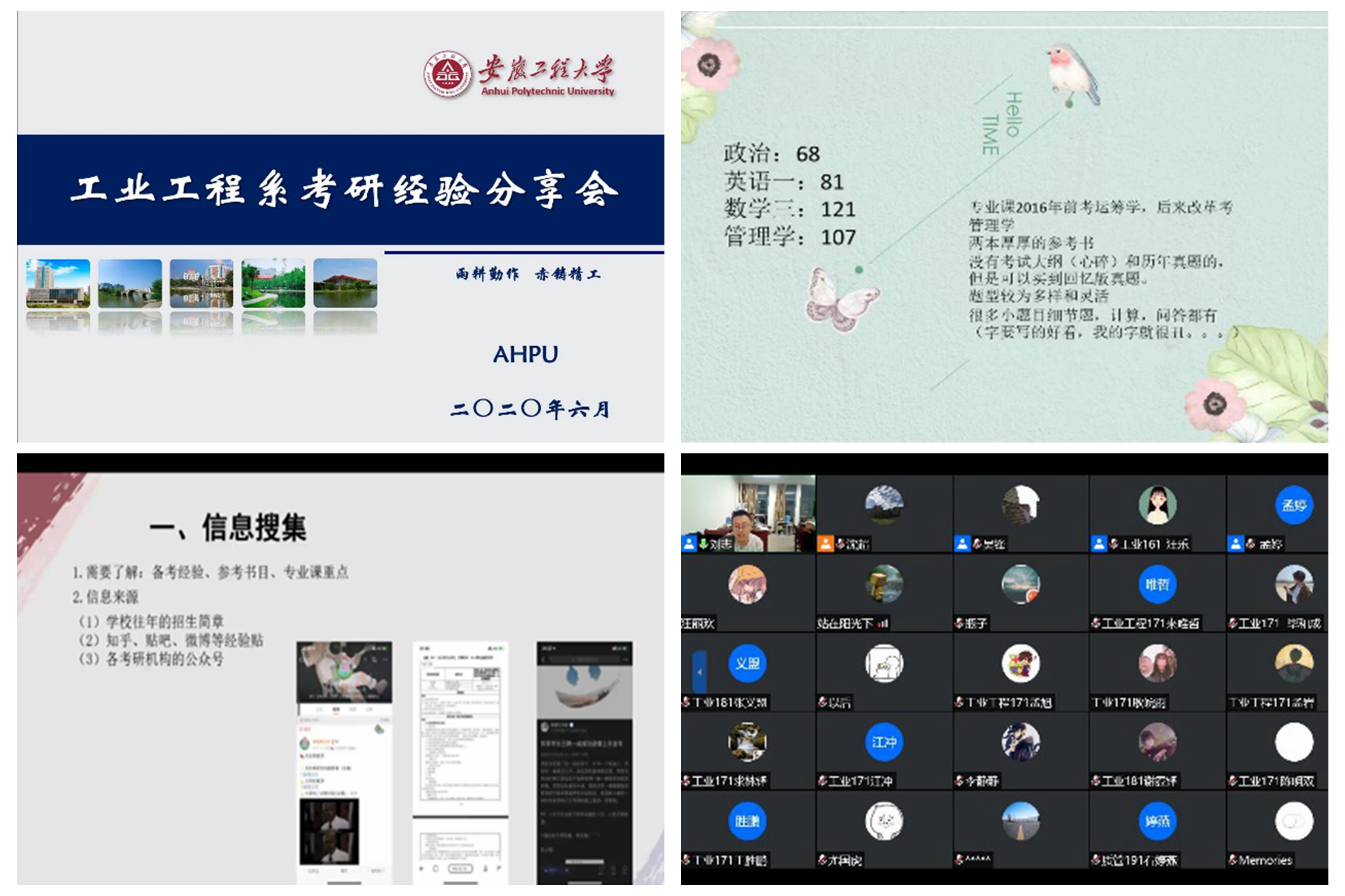 6月17日晚上,工业工程系教师党支部邀请今年考取研究生的三位同学给备战2021年考研的学弟学妹们线上分享考研经验和心得,并安排刘志、吴锋两位老师介绍往年考研情况、分析今年考研形势和解读考研相关政策,指导就业工作。
