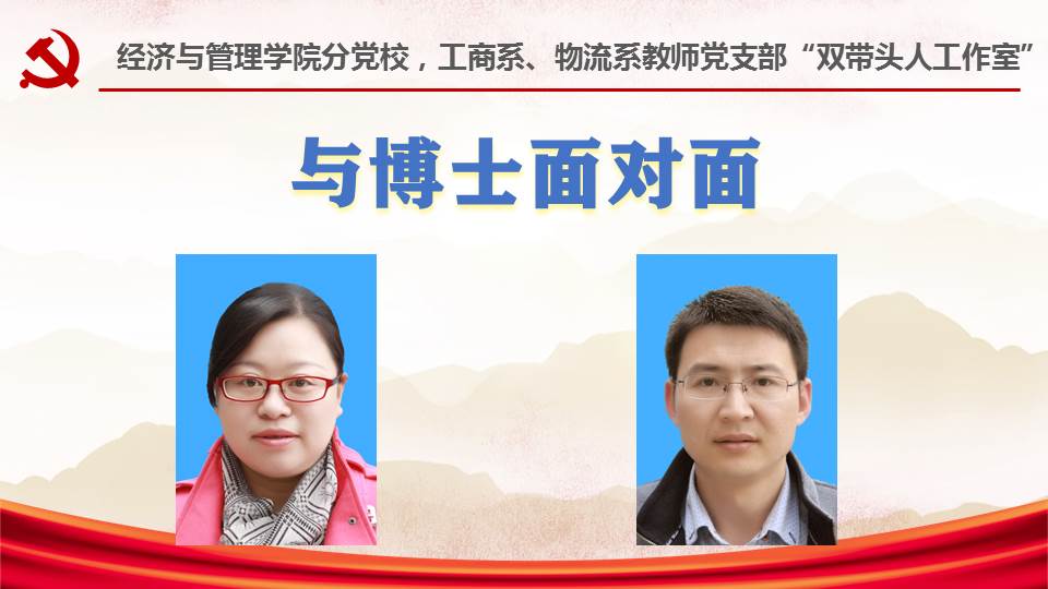 10月18日下午,经济与管理学院工商管理系教师党支部“双带头人工作室”和物流科学系教师党支部“双带头人工作室”联合开展“与博士面对面”交流活动,工商管理系朱敏、物流管理系程永宏两位博士教师与院分党校第六期发展对象培训班学员畅谈青春理想。活动在C座818会议室举行,由院党委书记邬海量主持。