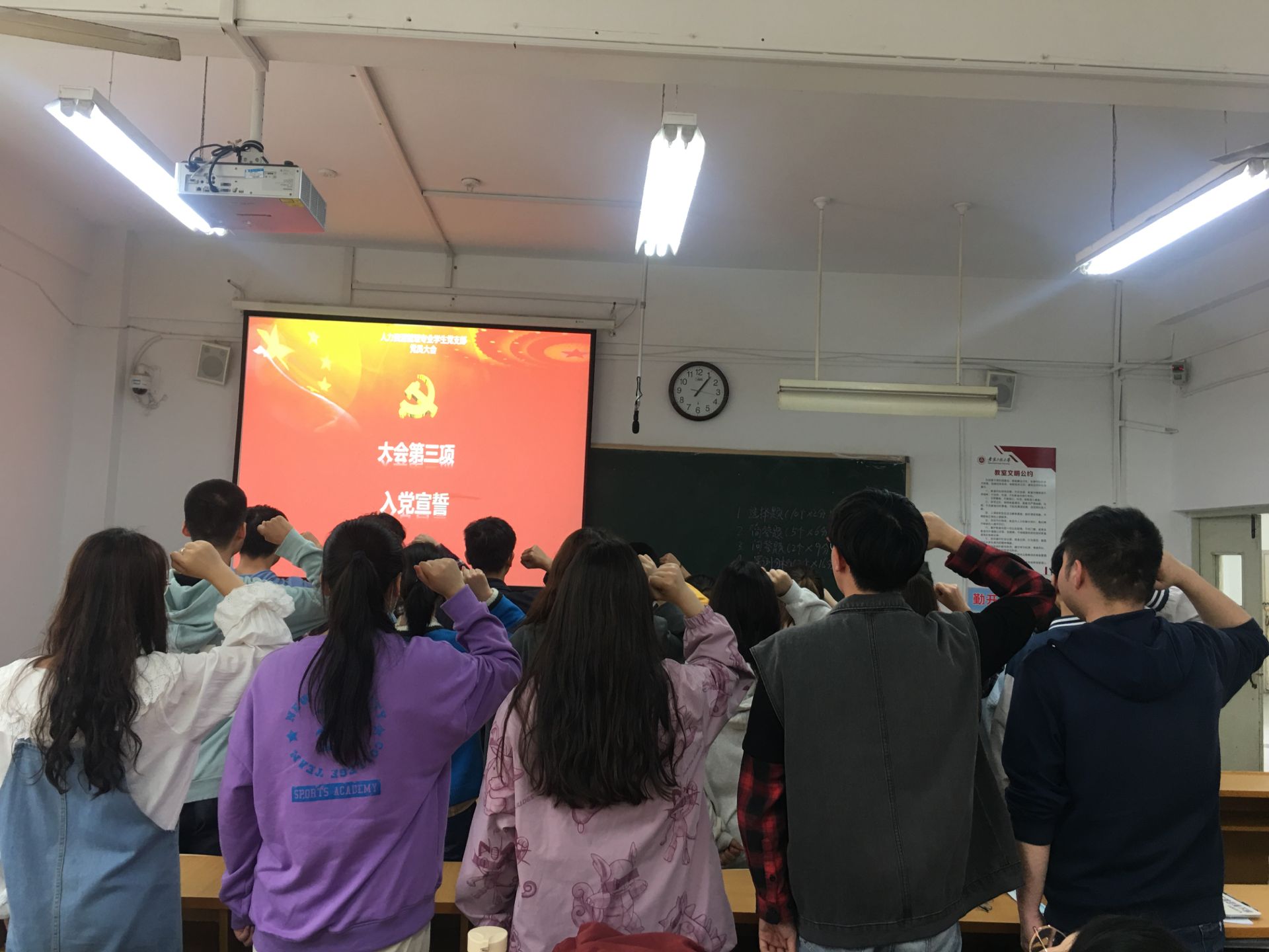 大会按照程序逐个讨论表决同意吸收19位发展对象为中共预备党员。支部全体党员面对鲜红的党旗举起右手,宣读入党誓词。“我志愿加入中国共产党,拥护党的纲领,遵守党的章程,履行党员义务……”短短八十个字,掷地有声。