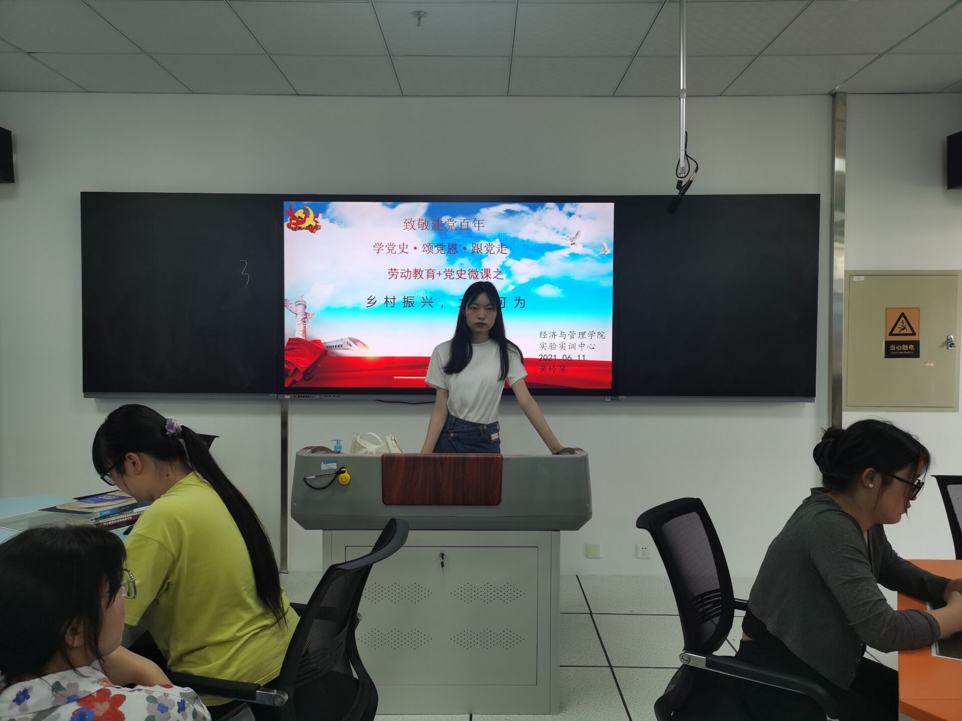 6月11日下午,为持续推动党史学习教育,致敬建党一百周年,加强学生劳动教育建设,切实提高学生劳动实践能力,经济与管理学院团委与院实验实训中心于C座924开展了第十期“劳动教育+党史教育微课”。