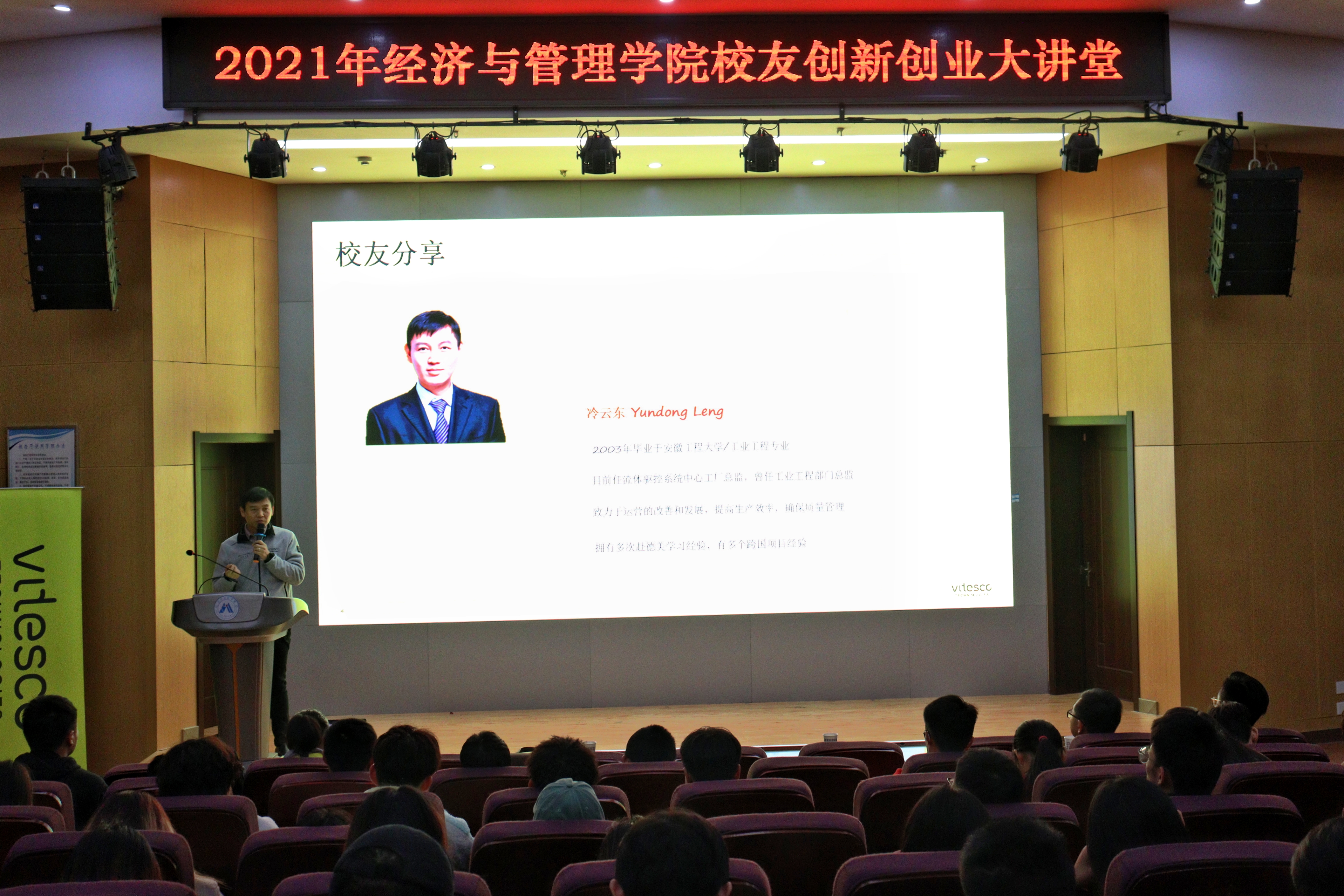 为解决大学生对创新创业问题的疑惑,增强创新创业能力,11月17日下午,经济与管理学院在C座七楼报告厅举办了“校友创新创业大讲堂”专题报告会。此次活动有幸邀请到纬湃汽车电子有限公司中心工厂总监、99级工业工程专业知名校友冷云东先生及纬湃汽车电子有限公司人事部张主管作专题报告,院党委副书记章兵、院长龚本刚、院党委副书记程繁、毕业班辅导员及18级工业工程专业、物流管理专业、质量管理专业学生出席本次活动。
