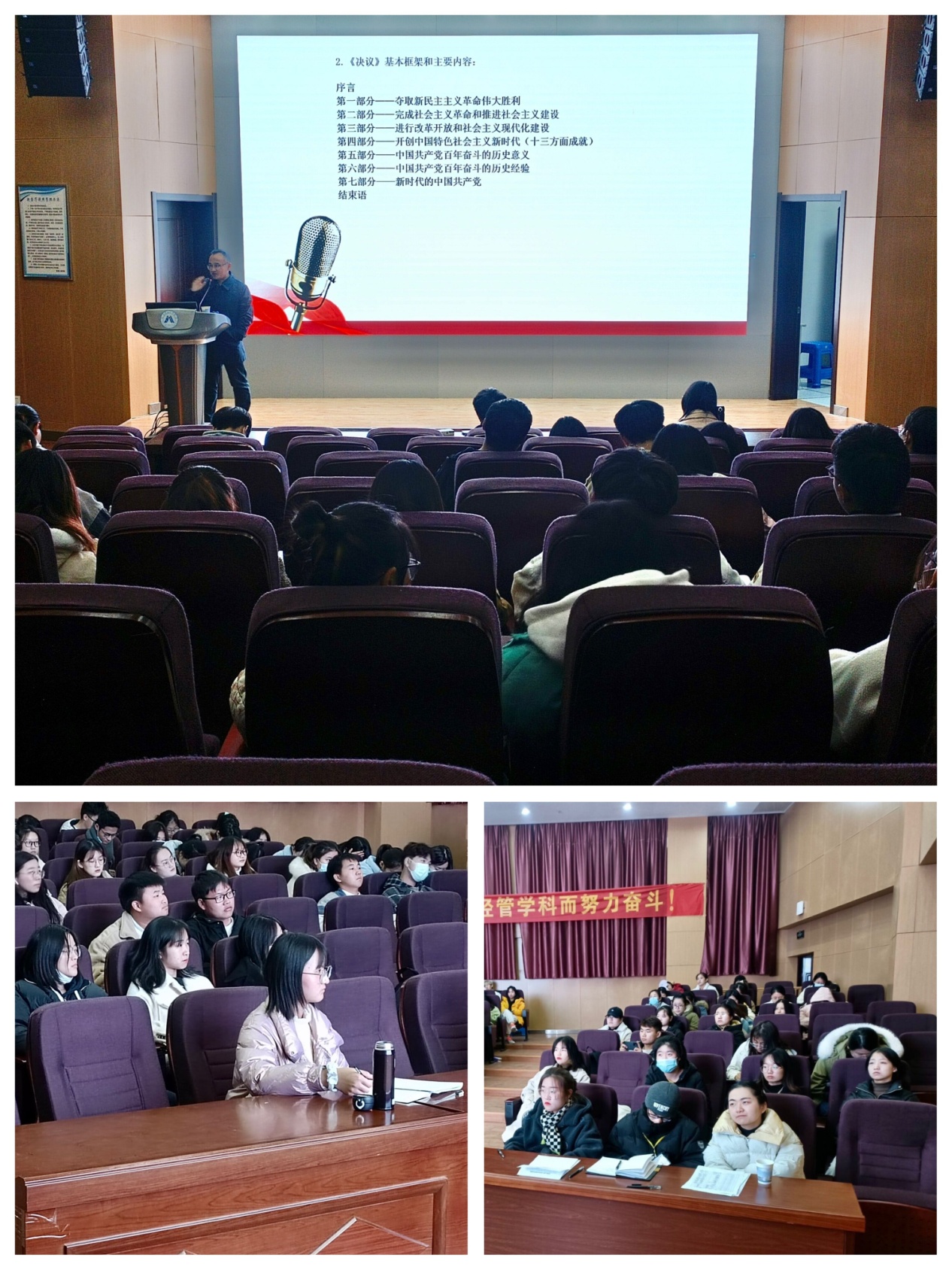 郭广春对党的十九届六中全会精神进行了深刻解读,同时鼓励同学们进一步坚定担当责任,不断加强进行伟大斗争的意志和本领,以史为鉴,增强大学生砥砺奋进的动力。