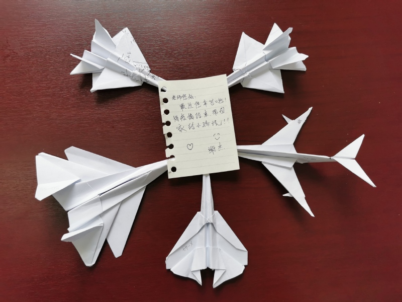 学院学子也被学院领导、教师和辅导员的行为所感动,纷纷留言点赞,并积极主动请缨做志愿者。有的学生为辅导员写下贴心感谢信,有的学生悄悄为辅导员买来晚饭,有的学生甚至将自己未穿的衣服送到辅导员办公室,更有学生为辅导员老师送来深藏爱心的“千纸鹤——纸飞机”。学生张怀苗说:“我真诚地感谢抗击疫情在一线的老师们,因为有你们从早到晚的辛苦付出,才有我们现在的安全。白色的防护服和红色马甲里,是一颗颗不辞辛苦、热血奉献之心。”