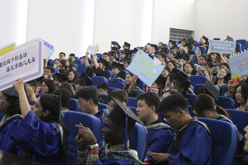 “曾经想征服全世界,到最后回首才发现,这世界滴滴点点全部都是你……”在毕业生离别之际充满感恩与回忆的歌声中,各专业学生代表将他们饱含深情写有最想对母校所说话语的宣传牌举起,典礼在全体同学共情合唱、齐声高喊“经管有我,未来可期,毕业快乐!”中结束。