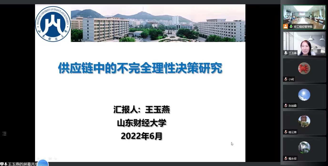 王玉燕教授作了题为《供应链中的不完全理性决策研究》的学术报告,报告主要阐述了王教授的最新研究成果,研究将企业的利他偏好行为拓展到零售商主导中小型制造商从属的低碳供应链,提出了成本共担联合利他偏好的协调机制,并构建多生产周期模型验证利他偏好对供应链协调的正向作用,减轻了中小型制造商采用碳减排技术的高成本压力,明确了政府扶持中小供应链企业低碳转型的策略和路径。