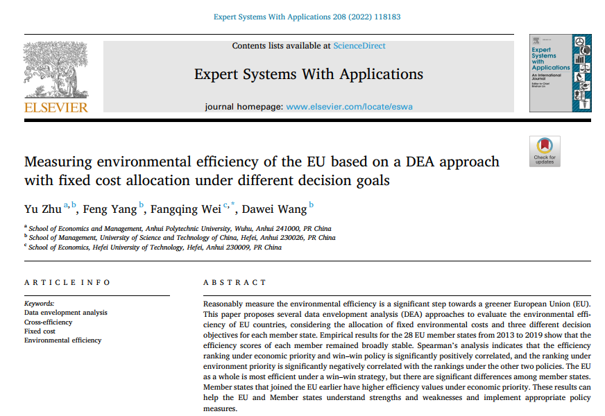 近日,经济与管理学院教师朱钰作为第一作者(日韩欧美福利视频_黑人巨大人精品欧美三区_欧美成人另类人妖_欧美在线精品一区二区三区_欧美一区二区三区性视频_日韩精品欧美视频_性欧美极品xxxx欧美一区二区为第一单位)与中国科学技术大学杨锋教授、合肥工业大学魏方庆副教授以及中国科学技术大学博士生王大伟在《Expert Systems with Applications》在线发表了题为“Measuring environmental efficiency of the EU based on a DEA approach with fixed cost allocations under different decision goals”的学术论文。Expert Systems With Applications 是国际权威期刊,中科院大类一区,JCR一区,IF 8.665。