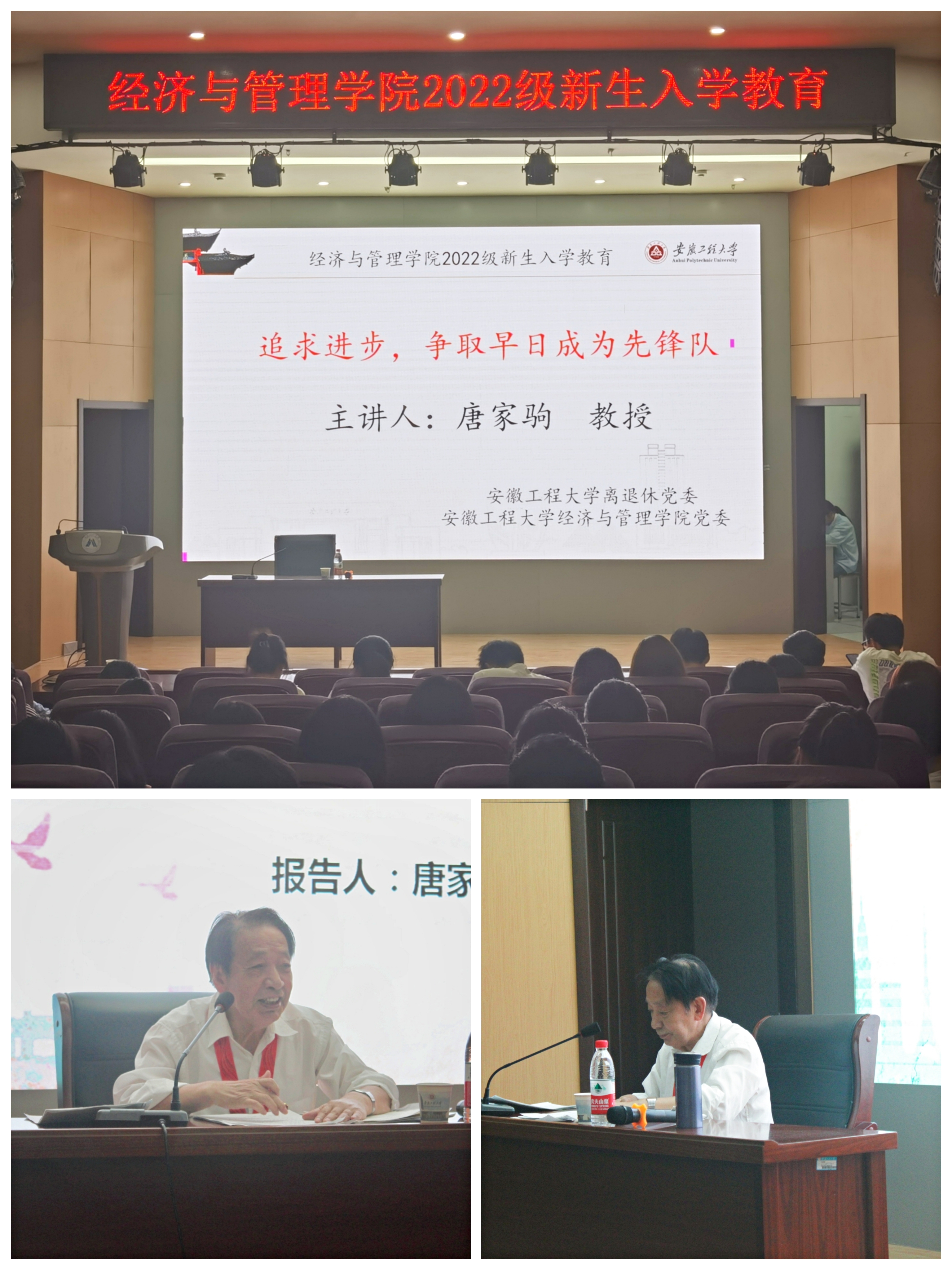 为帮助2022级新生正确规划大学生活,明确未来目标和发展方向,经济与管理学院于9月27日、30日下午,在C座七楼报告厅举办2022级新生入学教育,离退休党委老党员唐家驹教授为新生作了题为“追求进步,争取早日成为先锋队”的专题思政课,离退休党委第二党支部陈晓红书记出席了活动。