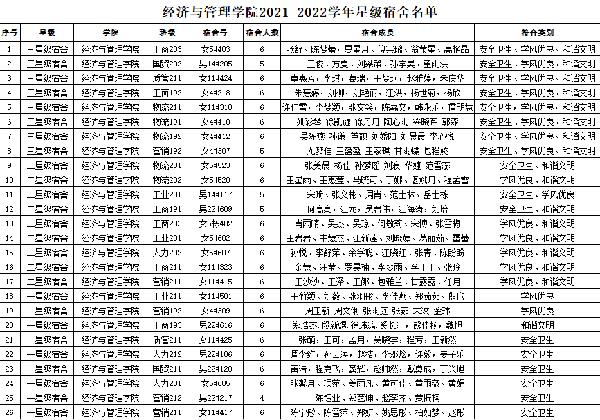 经济与管理学院学院2021-2022学年“星级宿舍”评选结果公示