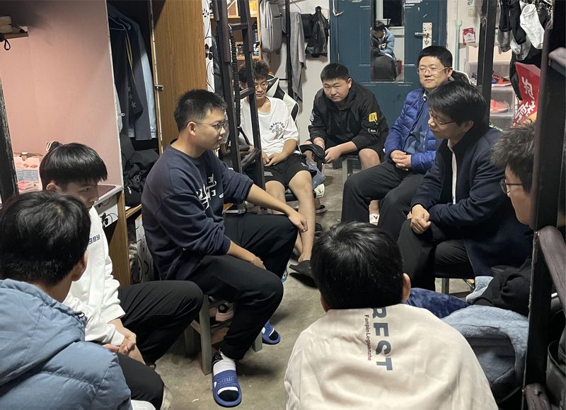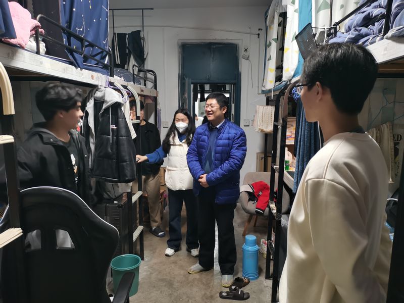 11月25日晚,学院党委书记水心宝、党委副书记刘海涛带领全体辅导员走访学生寝室。水心宝一行首先走访了男22#2019级、2021级男生寝室。走访过程中,水心宝详细查看了寝室卫生、用电安全等情况,叮嘱大家理解并认真遵守学校疫情防控规定,注意个人防护、做好个人卫生和寝室消毒通风等工作,还就校园电瓶车骑行等安全问题多次嘱咐。同时,水心宝结合学习宣传贯彻党的二十大精神,与各专业同学促膝长谈,引导青年大学生要坚定不移听党话、跟党走,怀抱梦想又脚踏实地,敢想敢为又善作善成,立志做有理想、敢担当、能吃苦、肯奋斗的新时代好青年。