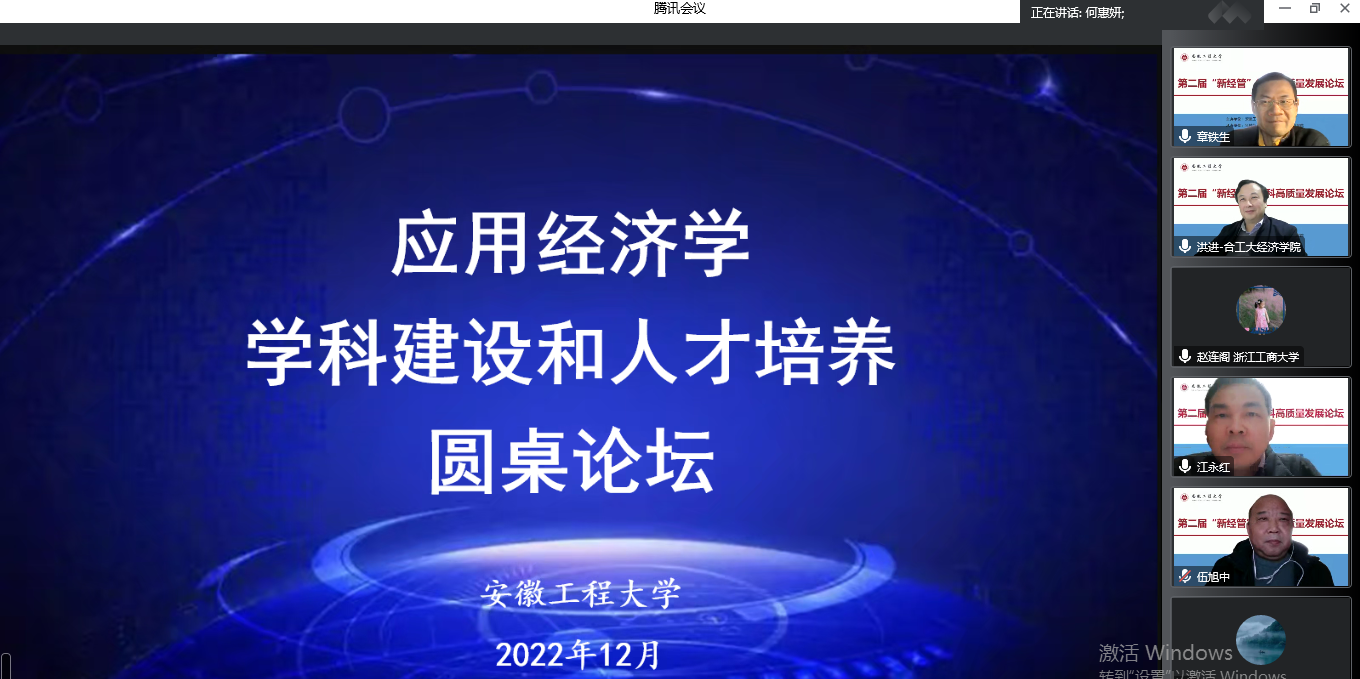 在下午举办的“应用经济学学科建设和人才培养”为主题的圆桌论坛中,经济与管理学院副院长蔡书凯详细介绍了我校应用经济学学科建设的基本情况,浙江工商大学经济学院院长赵连阁、合肥工业大学经济学院院长洪进、安徽大学经济学院副院长江永红、安徽师范大学经济管理学院副院长伍旭中、安徽工业大学商学院院长章铁生分享了各自学校在学科建设、人才培养中的宝贵经验,并就应用经济学学科建设、人才培养、团队和平台建设、高端成果转化等话题进行了广泛交流和研讨。