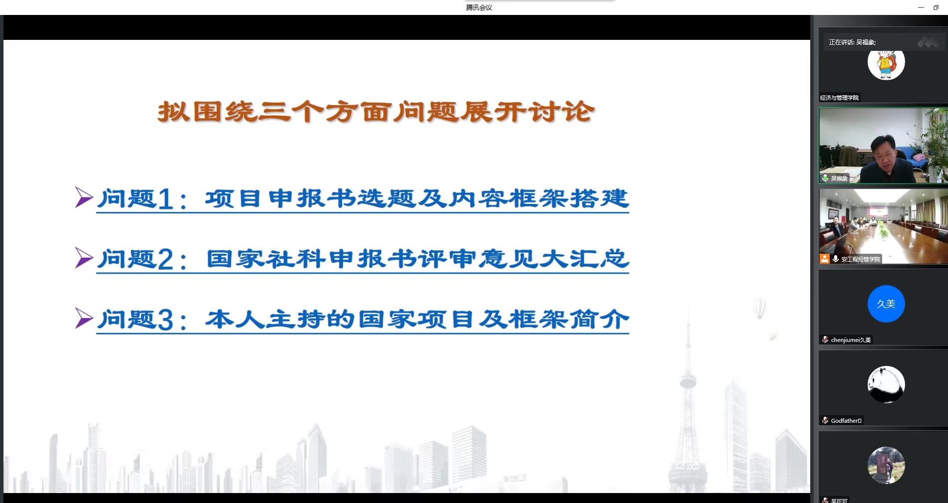 1130午,经济与管理学院在C818会议室举办了国家基金选题辅导会,南京大学教授、博士生导师吴福象应科技处、研究生部和经济与管理学院的邀请作国家基金辅导报告。报告会由经济与管理学院副院长蔡书凯主持,学院院长龚本刚、学院部分教师通过线上、线下方式参加了交流报告会。