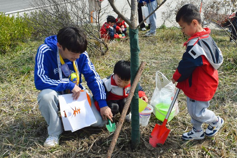 植树现场,院青马班学员作为老师给春水湾幼儿园小朋友义务授课,为他们讲授植树节的由来和环保等相关知识,并教会小朋友画树叶画、悬挂心愿卡等。在一个个生动有趣的小游戏中,教导他们种下的不仅是绿色树苗,也是祖国的美好未来,让“爱护环境”、“绿水青山就是金山银山”的绿色种子在他们幼小的心中生根、发芽。
