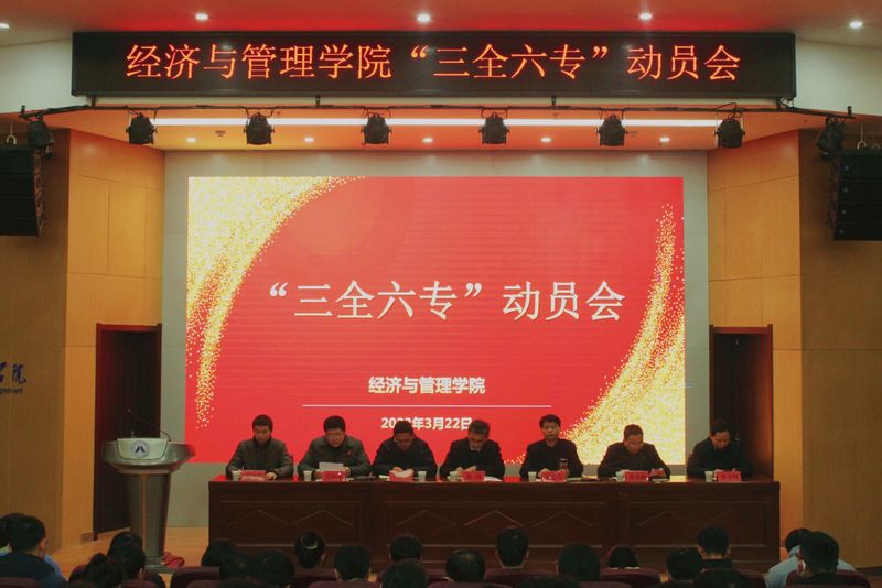 为深入贯彻学校党委“三抓”工作部署,推进“三全六专”育人实践,经济与管理学院于3月22日下午在C座7楼报告厅召开“三全六专”动员会。校学生处处长黄炜,校团委副书记李恒奎,经济与管理学院党政领导,各系部教师代表,各班级学生代表近200人参加会议,会议由学院党委副书记刘海涛主持。