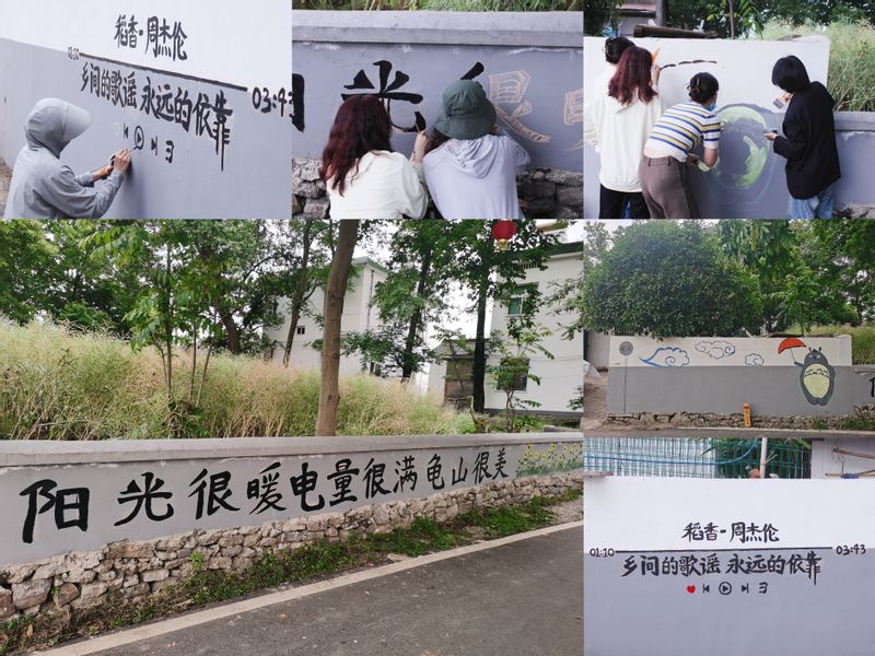赵恒梅的指导和村干部的协助下,10多名学生承担起了“乡村彩绘师”的角色,文案“构图”到“素描”再到“上色”,大家分工合作,利用村民房屋的墙体根据周围环境,结合当下网络热点,创作出“乡间的歌谣”、“龟山站”、“龟山很美”为主题的墙绘作品。