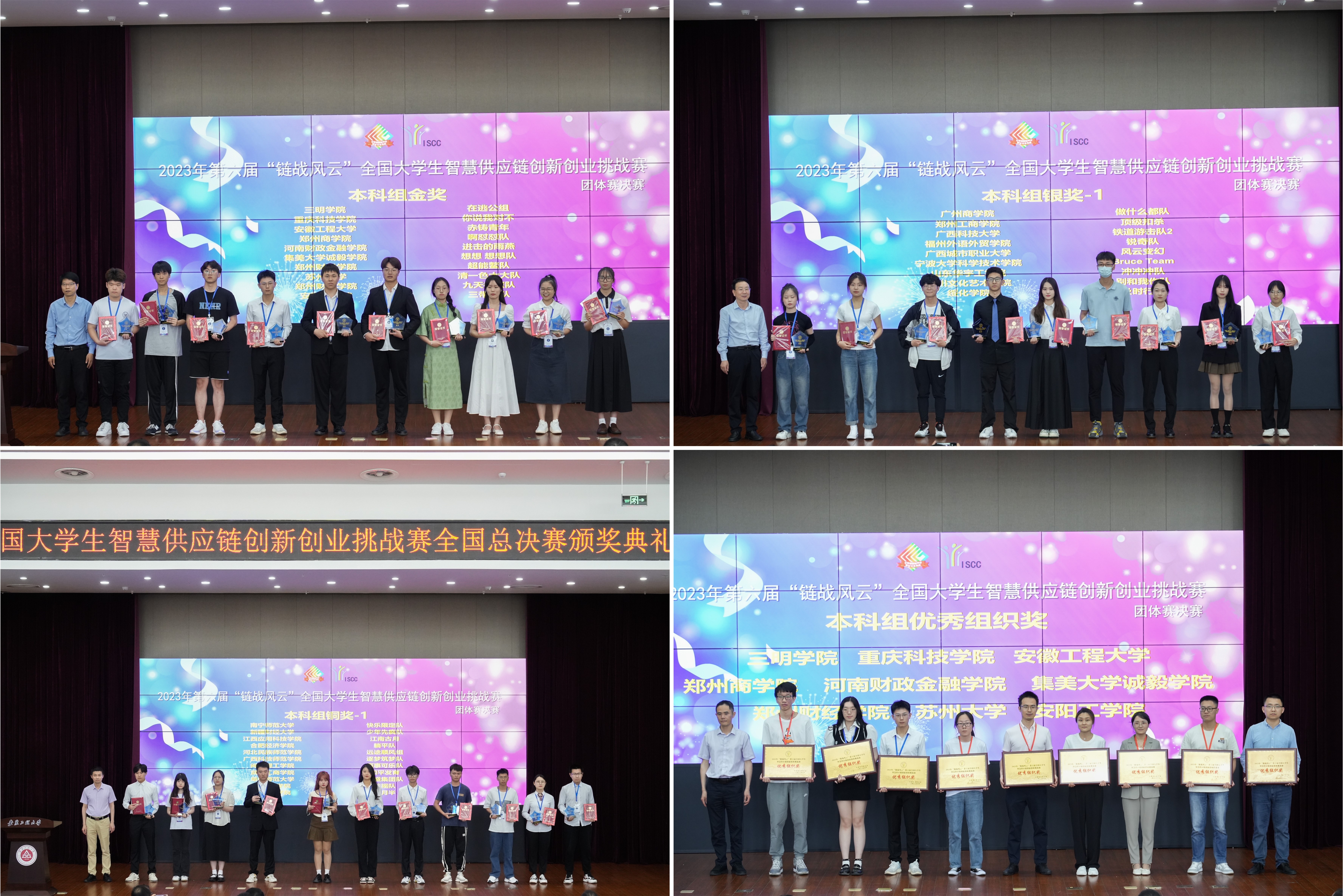 经过为期两天的激烈角逐,大赛决出本科组金奖10队、银奖17队、铜奖21队;制造商创新创业金奖1队、分销商创新创业金奖1队、零售商创新创业金奖1队、物流商创新创业金奖1队、供应链运营实践金奖1队、供应链协同运营金奖4队;高职组金奖9队、银奖15队、铜奖19队、制造商创新创业金奖1队、分销商创新创业金奖1队、零售商创新创业金奖1队、物流商创新创业金奖1队、供应链运营实践金奖1队、供应链协同运营金奖4队。大赛组委会为获奖队伍进行了颁奖。我校经济与管理学院程永宏和董丰老师指导,朱永俊、付恩民、许晴和吴伟杰四位同学组成的赤铸青年队获得了本科组团体赛金奖,本次成绩刷新了我校参与全国大学生智慧供应链创新创业挑战赛以来的最好成绩。学校被中国商业联合会授予“优秀组织奖”。