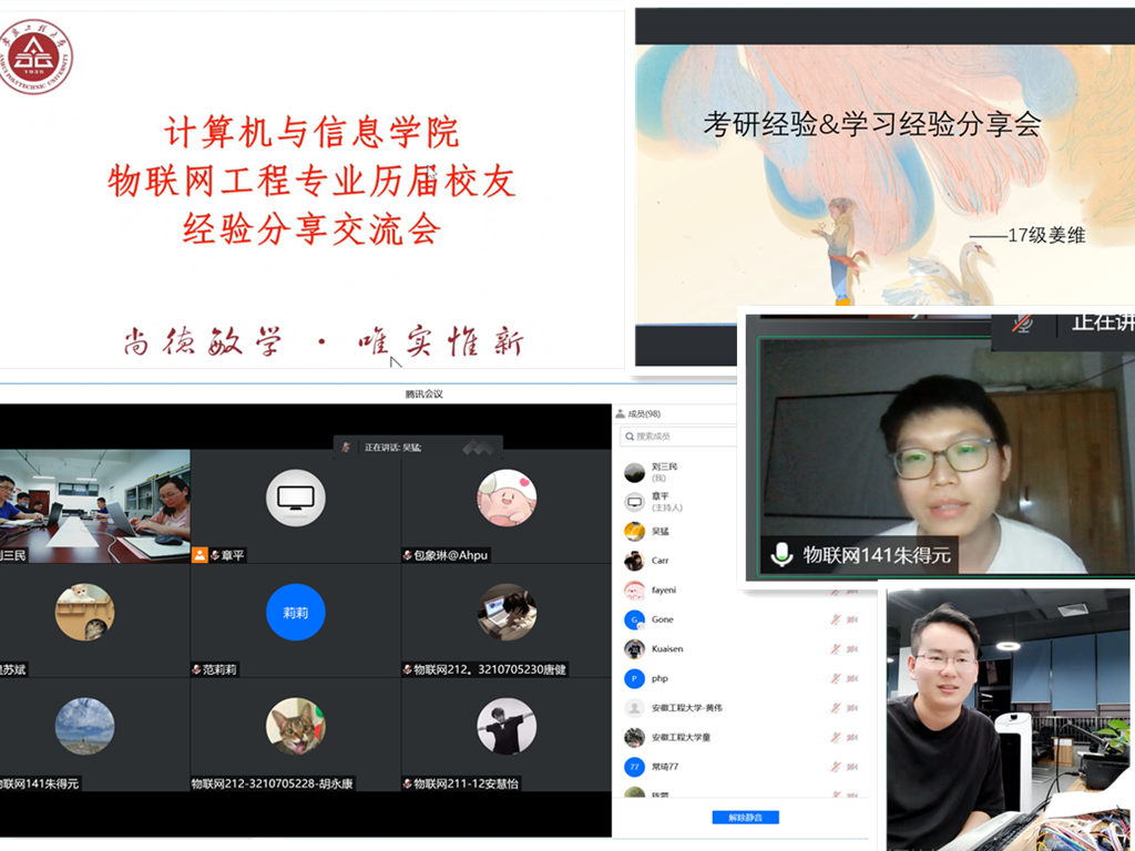 5月31日晚7:00,物联网工程专业优秀校友经验分享交流会在线上召开。计算机与信息学院副院长刘涛,物联网工程系教师以及物联网工程专业的学生参加了线上交流分享会,会议由系副主任章平主持。此次邀请到的六位优秀校友分别是13级李金良、14级吴猛、14级朱得元、16级杨震、17级姜维、17级秦文全。