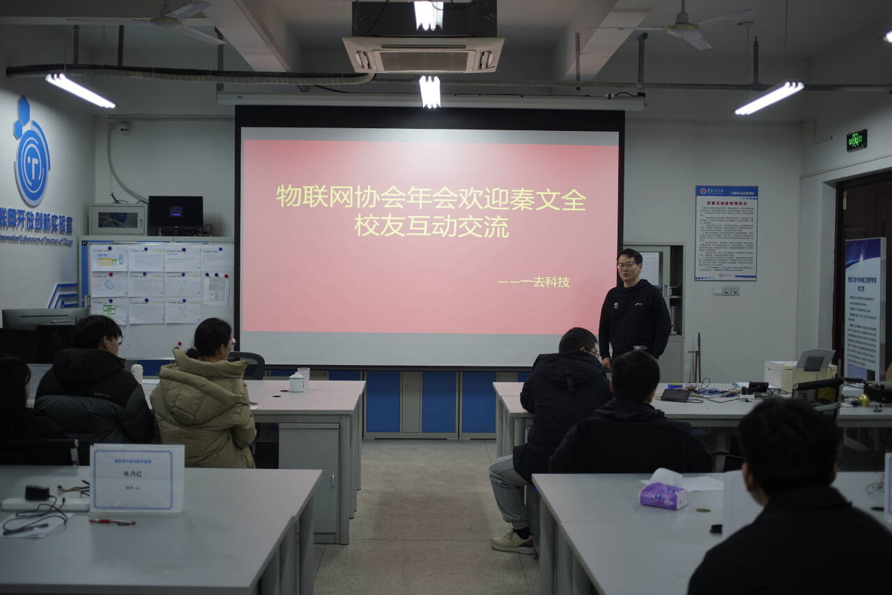 本次年会也有幸邀请了协会的优秀校友——秦文全与大家互动交流。秦文全讲述了他和物联网协会的渊源,向大家分享了自己在协会中学习和成长的经历,以及创立公司的历程。他鼓励同学们明确自己的职业目标并勇于接受变化和挑战,同时也鼓励同学们和他多交流,希望能够碰撞出更多不一样的火花,产生更多更好的创意,也进一步希望能和物联网协会共同成长,并肩前行。