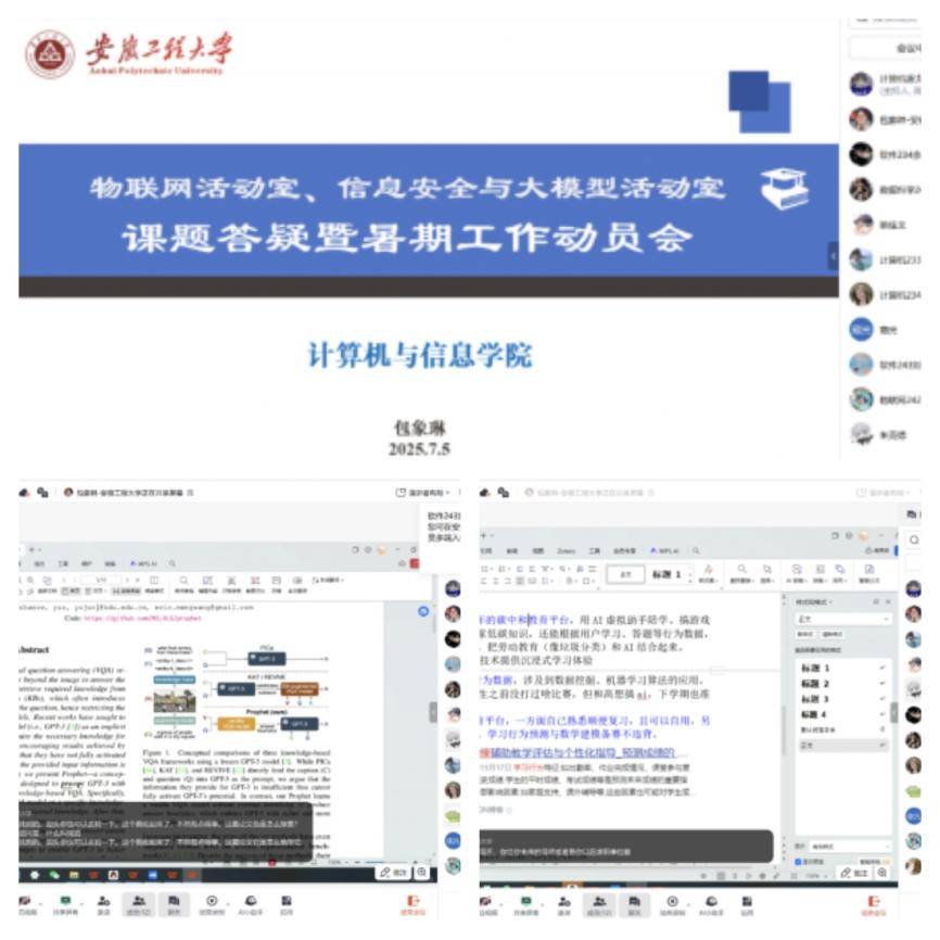 物联网创新开放活动室、信息安全与大模型创新开放活动室于7月5日开展线上课题答疑暨暑期工作动员会,会议由活动室包象琳老师主持,20余名来自不同专业的同学参加了本次活动。