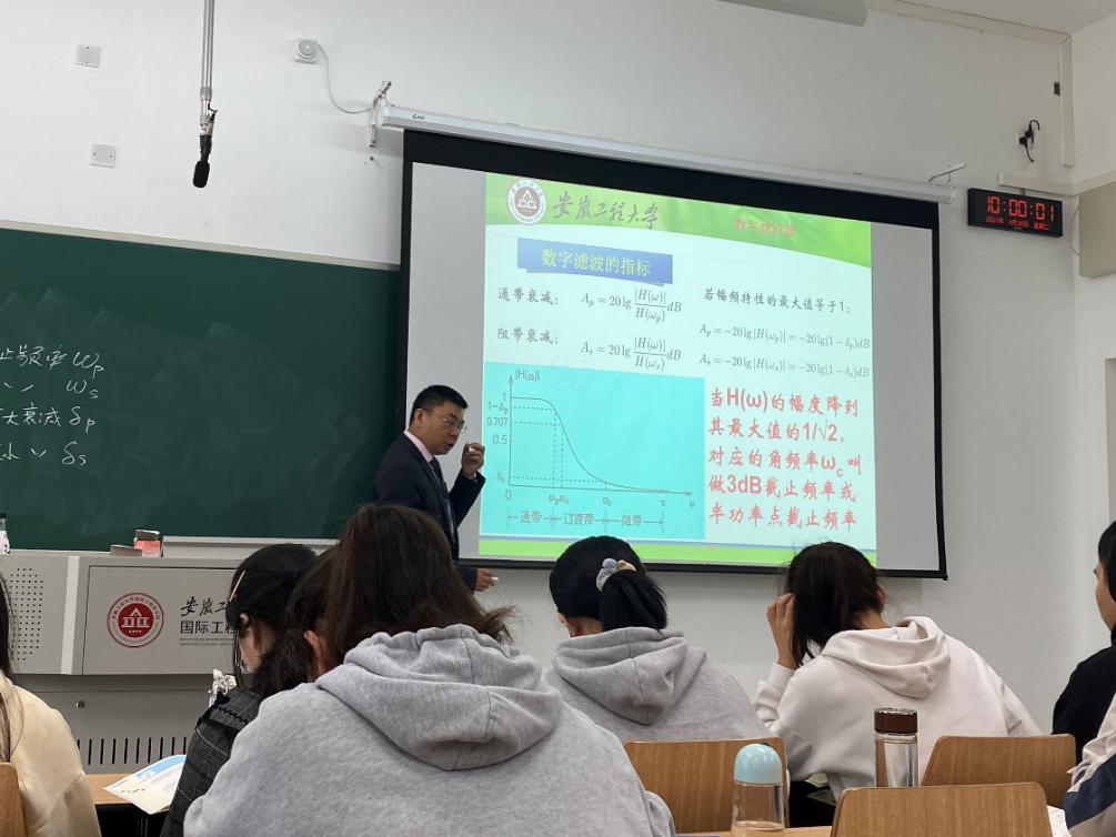 王海教授主讲课程《测试信号与处理技术》,从数字信号与模拟系统之间的相关性入手,阐述了数字滤波器与模拟滤波器之间的相似性和区别,结合数字系统的分析与设计的具体需求,讨论了从不同层面反映一个数字滤波器的滤波器原理的表示方法及其设计技巧。同时结合具体案例,将数字滤波器的设计和计算过程进行了由浅入深的讲解。讲解过程环环相扣,课堂精彩纷呈,讲课风格风趣,善用启发式教学方法,不仅吸引着学生,在座的教师们也都跟着他的思路参与了问题的思考。
