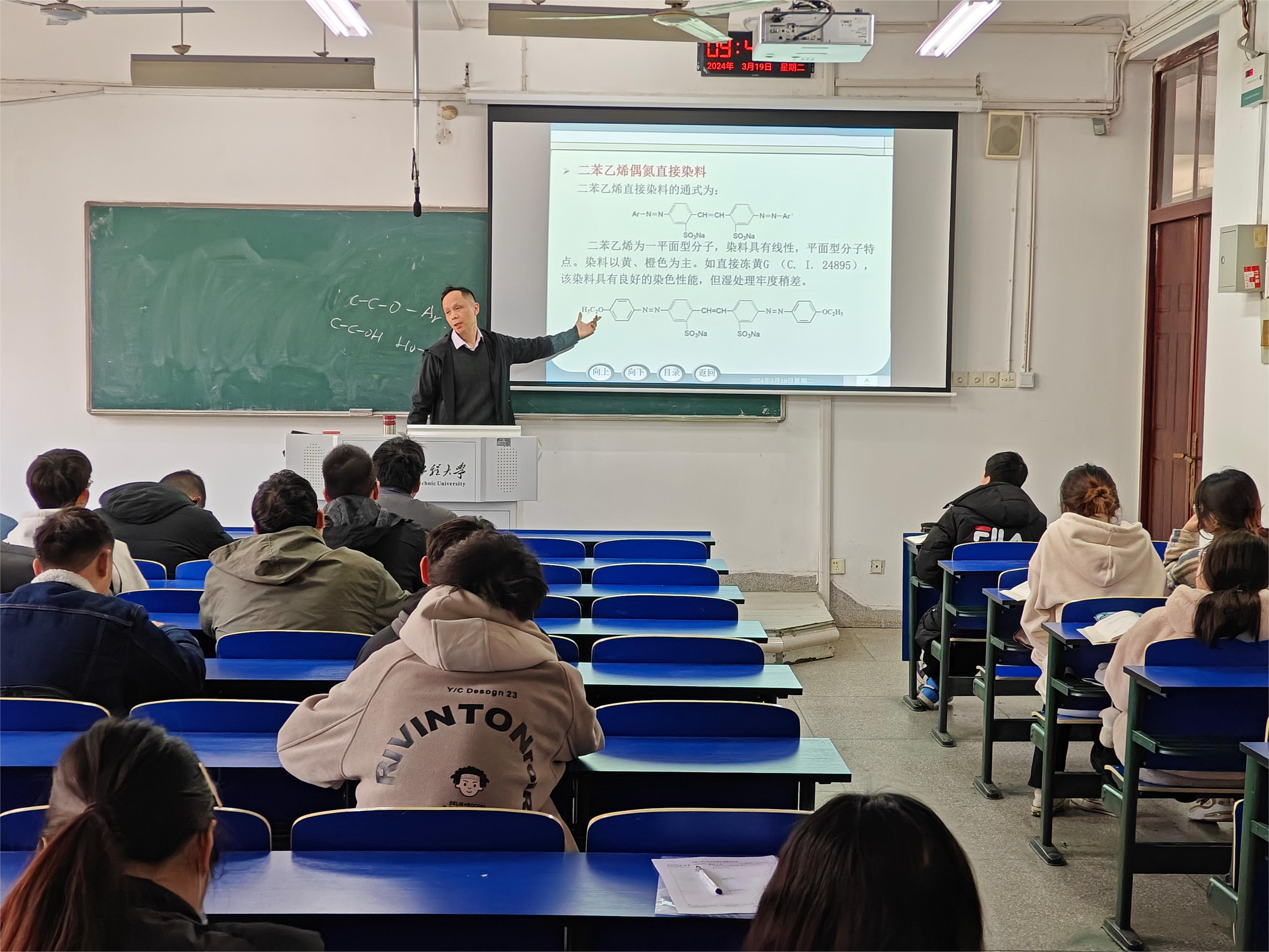 3月19日,纺织服装学院在6J107组织开展了“金”彩一课示范教学观摩活动。本次示范课由陶旭晨老师主讲,课程为《染料化学》。部分青年教师进行了现场听课观摩。