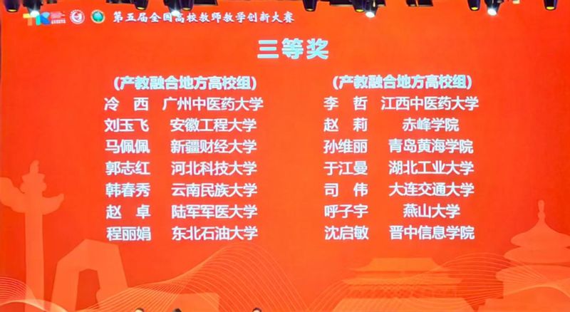 据悉,全国高校教师教学创新大赛是教育部高等教育司指导,中国高等教育学会主办的全国性最高级别的教师教学竞赛,实现全国省份全覆盖、本科高校全覆盖、学科门类全覆盖、各类教师全覆盖,体现我国高等教育教学改革的最新成果,具有十分广泛的影响力和示范辐射效应。本届大赛以“推动教学创新,培养一流人才”为主题,共有12.7万名教师参加校赛,3.4万名参加省赛,588门课程2253名教师入围国赛,分新工科、新文科、课程思政、产教融合等七个赛道,分设正高、副高、中级及以下3个组别。本届国赛共有88个教师(团队)获得一等奖、205个教师(团队)获得二等奖、295个教师(团队)获得三等奖。(文:李凯;图:张金轮;预审:张金轮;审核:夏登峰)