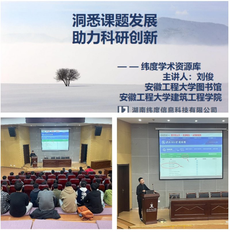 本次讲座活动分为两个阶段。第一阶段,刘俊以“洞悉课题发展,助力科研创新”为主题为同学们做报告。报告中,刘俊首先介绍了“纬度学术资源库”和“纬度外文专题库”,并围绕纬度学术在科研文献检索、下载,分析主题,课题热点追踪,科学选刊等方面的应用做了详细的讲解。整个报告干货满满,学生受益匪浅。