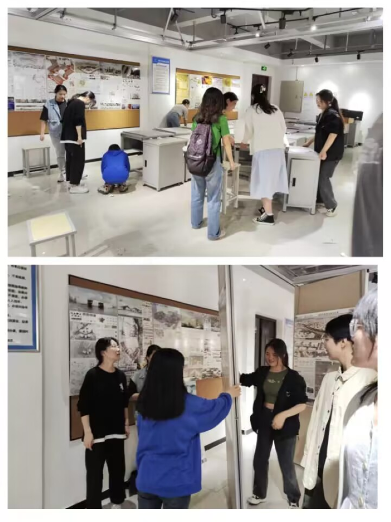 活动中,建筑学系教师党支部与建筑学学生党支部的党员们热情洋溢,充分发挥了“不怕脏、不怕累”的优良作风和团结协作的精神,对展厅场地的桌面、地面、门窗等进行了细致地卫生清扫。本次展览以展板、实体模型等方式体现同学们的创意成果。展出内容包含毕业设计、课程作业以及产学研项目。整理过的展厅各个展板摆放整齐有序,焕然一新,相关实践教学材料、展厅介绍等工作也准备就绪,充分做好了迎接工程教育认证专家进校考察的各项前期工作。