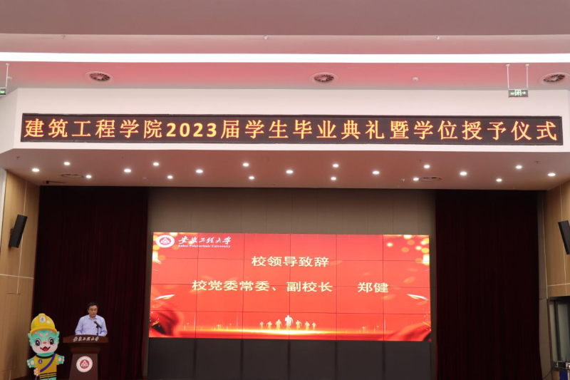 郑健在典礼上发表了热情洋溢的毕业致辞。他代表学校向即将奔赴祖国各地的毕业生们表示热烈的祝贺,向为同学们的健康成长辛勤工作、无私奉献的老师们表示诚挚的敬意,向把心血和希望寄托在同学们身上的家长们致以衷心的感谢!他向全体毕业生提出三个问题:大学生活,我们收获了什么?毕业季,我们能做什么?毕业后,我们能向母校回馈什么?同时,郑健希望全体毕业生:坚持梦想,勇于超越,将自己的人生梦想融入到国家和民族的伟大事业中,为实现中国梦贡献青春才智;终身学习,敢于担当,以知识、毅力和情操塑造和完善自己,不断提升自身素质和能力,做一个有担当的人;砥徳修身,完善自我,始终牢记仁德之美,成为一个德才兼备的社会有用之才。他希望毕业生们秉承母校“尚德敏学·唯实惟新”的优良传统,努力成为一名优秀的建筑师、工程师、创业者和企业家,为我国的建筑事业做出卓越贡献!