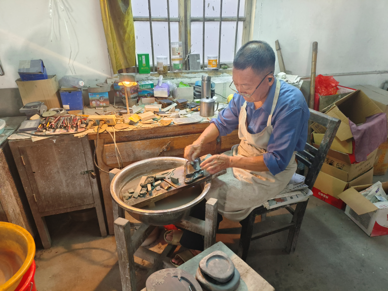 古旧的制作车间里,伴着阵阵墨香的是氤氲的热气、随处可见的墨饼和叮叮当当的铁锤敲击声。和料间里熏黑的墙壁、看不出原色的开水瓶、满脸黑色汗水的和料工、制墨间里磨得光滑的长凳,以及渗透着墨色的木墩,处处都是手工制墨留下的岁月痕迹。