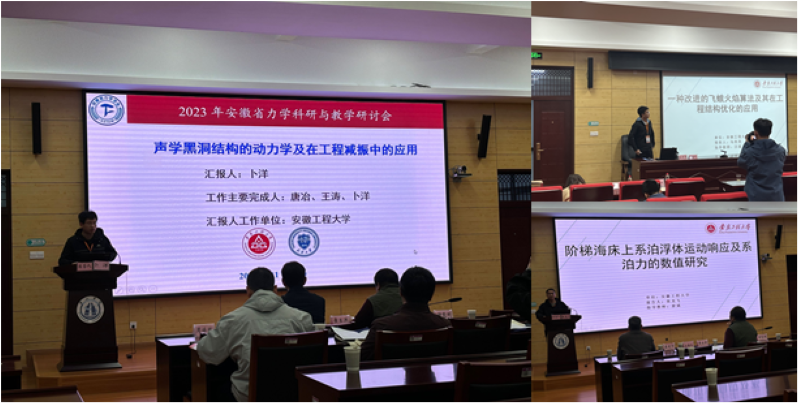 此外,我院教师卜洋作了题为“声学黑洞结构的动力学及在工程减振中的应用”的学术报告,并获得青年教师优秀报告奖。同时,我院研究生马亮亮、张龙飞分别作了题为“一种改进的飞蛾火焰算法及其在工程结构优化的应用”、“阶梯海床上系泊浮体运动相应及系泊力数值研究”的学术报告,并获得研究生优秀报告奖。