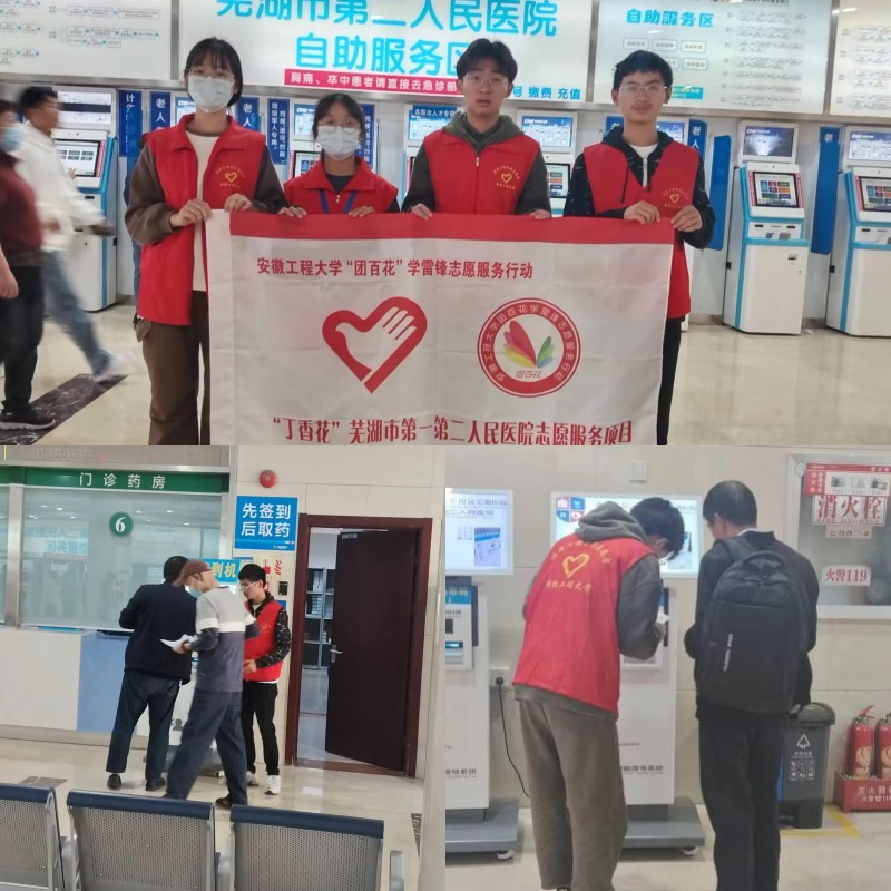 医院导医活动。“丁香花”导医志愿者们分别前往了芜湖市第一人民医院和第二人民医院进行了导医活动,协助市民使用自助服务机器进行挂号、缴费等操作,给市民提供了更加便捷高效的就医服务。志愿者耐心细致地为患者提供指引,如同一股清流,为医院注入了温馨与关怀。