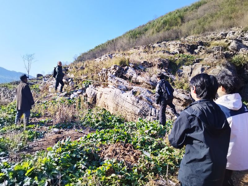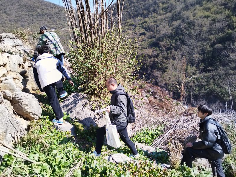 在龙山村驻村干部和当地村民的带领下,师生依照指示标识进入山区的地块区域,对每块地块进行测量,细致填写纸质测量数据,最大化地保证测量数据的精准度。山区地形复杂起伏大,且多为未开发片区,给测量带来了很大挑战,衣服被划破、鞋子被戳破,测量师生徒步爬山越坡,坚持实地核对、丈量、填表提供参考,为准确计算龙山村中药材种植面积提供保障。