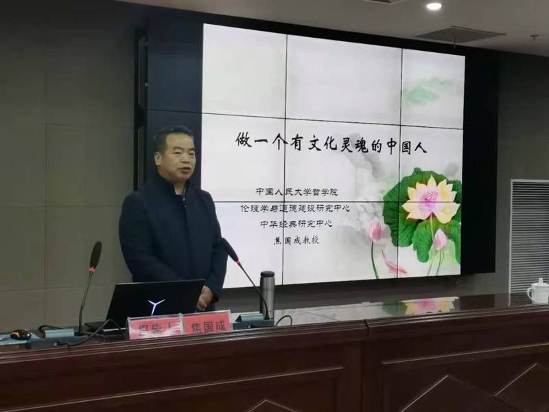 11月13日,中国人民大学哲学院教授、博士生导师,中华经典研究中心主任,国家社科基金评审专家,中宣部马工程伦理学教材首席专家焦国成教授,应马克思主义学院邀请来校开展“做一个有文化灵魂的中国人”专题讲座。讲座由马克思主义学院副院长刘德军主持,学校辅导员代表、各学院团委书记、思政课教师以及马克思主义学院研究生等参加报告会。