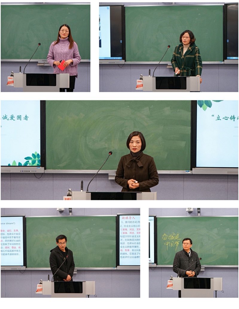 教学展示环节,五位教师分别选取《我们神圣的国土》《促进民族团结》《实现中华民族伟大复兴的中国梦》《“立心铸魂”,做新时代的忠诚爱国者》《奋力实现中国梦》等课程内容,展示了不同阶段学生的爱国主义教育,他们或运用爱国歌曲影片烘托、小组展示等手段;或从自身援疆经历出发现身说法;或通过情景教学全方位、立体化深化爱家爱友爱祖国的情感;或通过系统性说理引导广大青年要树立远大理想、热爱伟大祖国、担当时代责任;为参加备课会的师生展示了风采各异的思政课程。