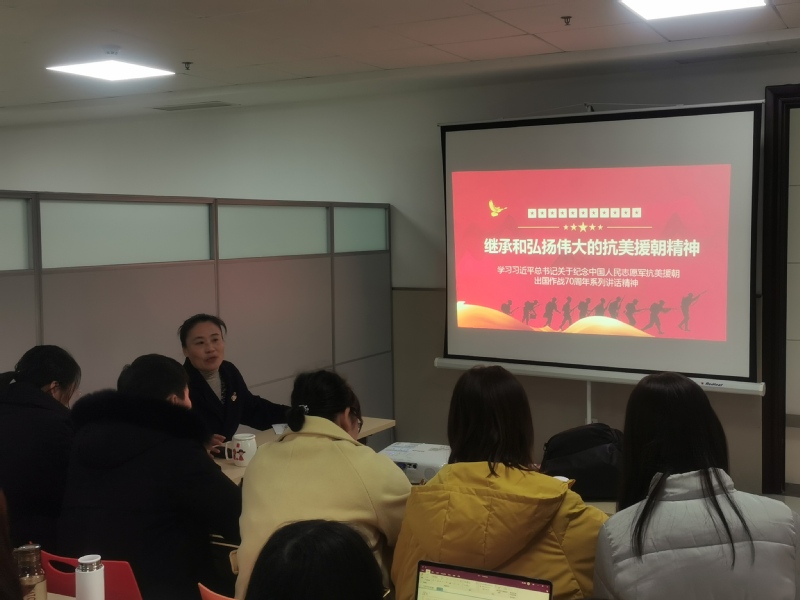 吴月红首先以习近平总书记讲话中提及的三个“我们始终没有忘记”为切入点,表达了对在抗美援朝战争中英勇牺牲的烈士们的崇高敬意和深切怀念。接着,她通过回顾抗美援朝战争的背景和历程,阐述抗美援朝战争伟大胜利的深远意义,号召广大党员要传承和发扬伟大的抗美援朝精神,尤其对广大青年学生提出殷切希望。